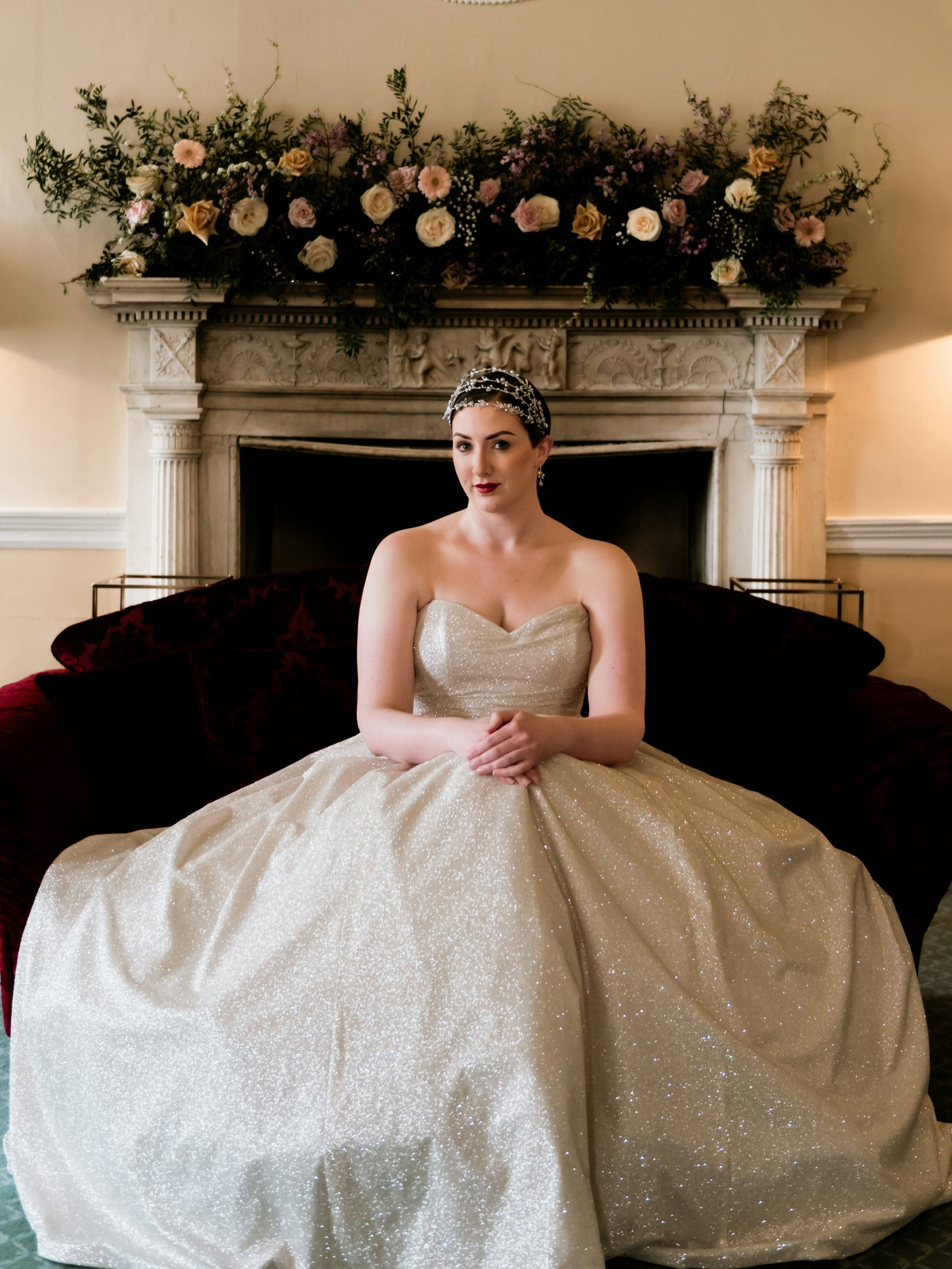 Adorn your bridal look with something truly divine. Our Celestial Headdress features 4 bands of intricate beading and is set with Swarovski crystals and grey pearls in a soft, silver hue. Guaranteed to be one-of-a-kind, this show stopping headdress is straight from the stars.