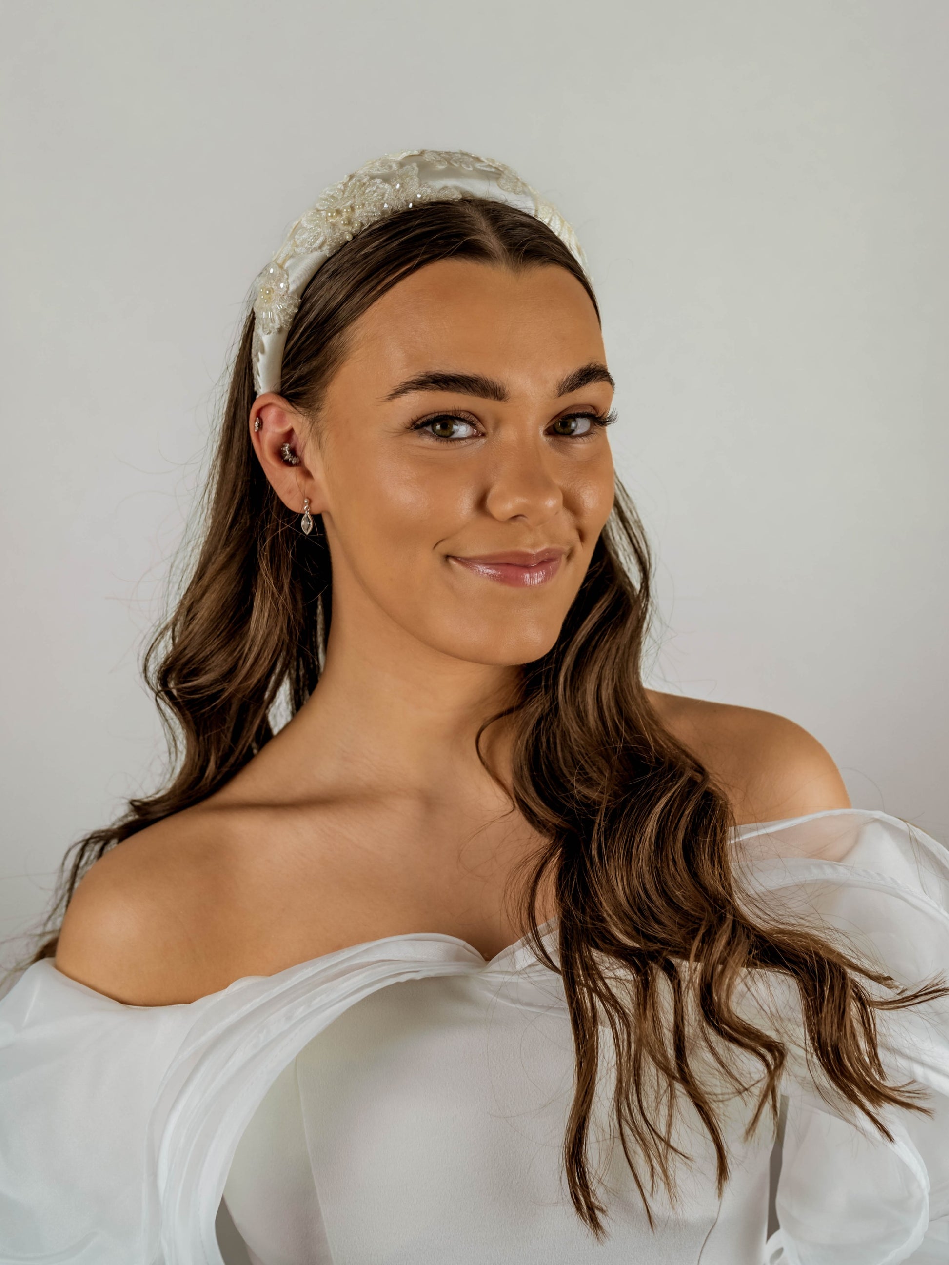 Set with beaded floral lace on an ivory satin padded headband.