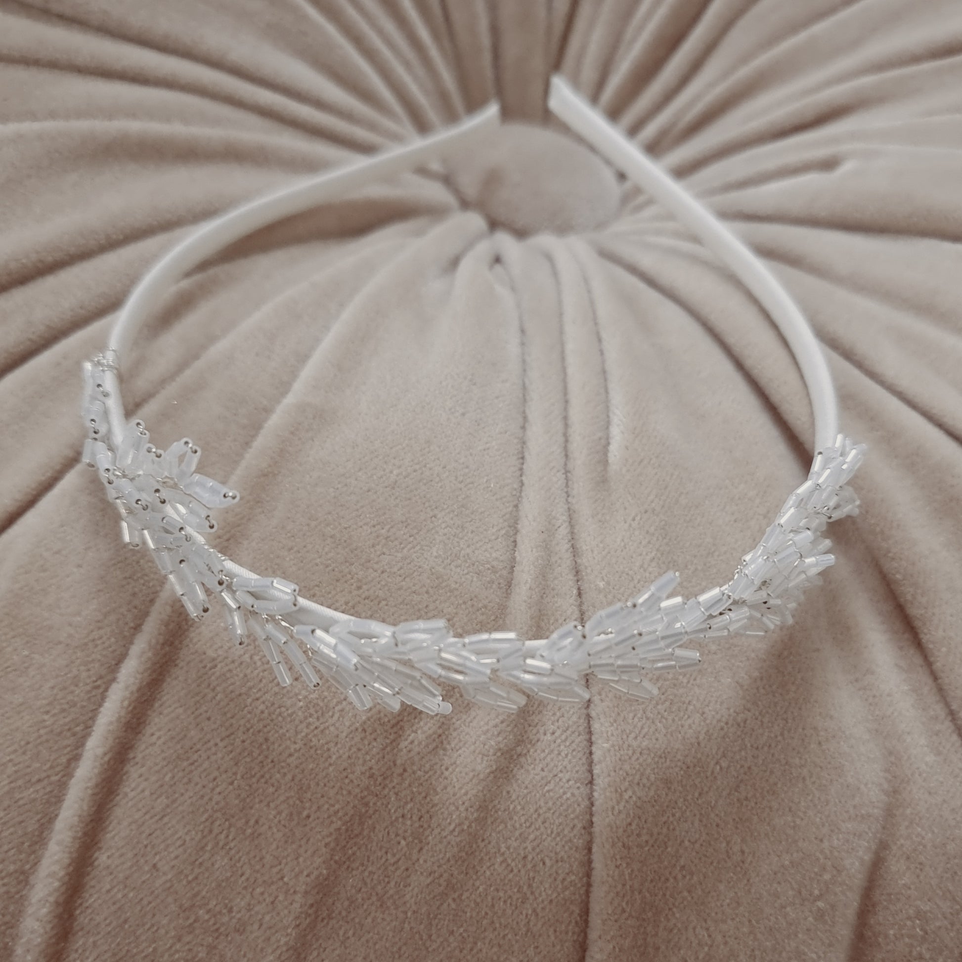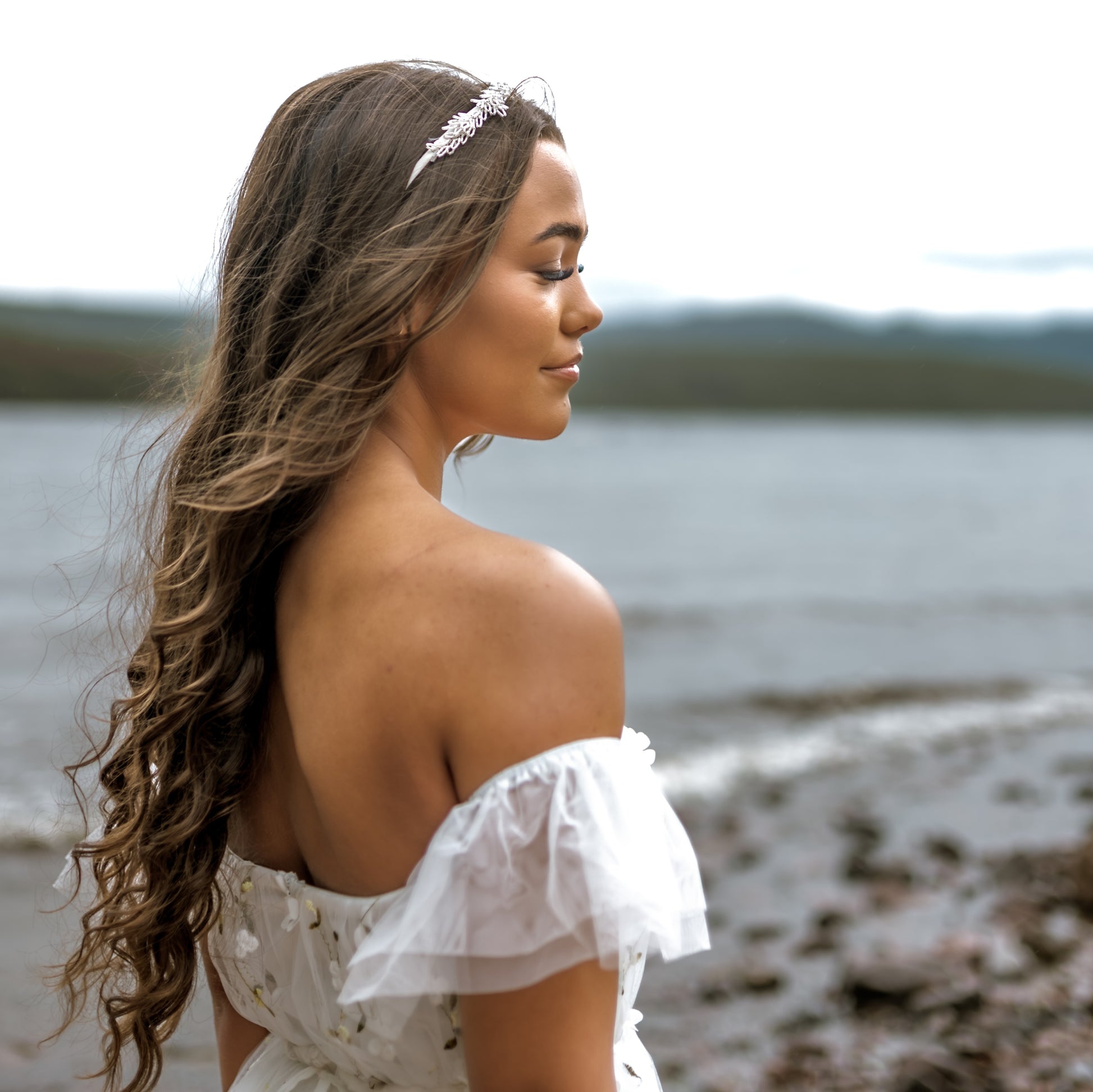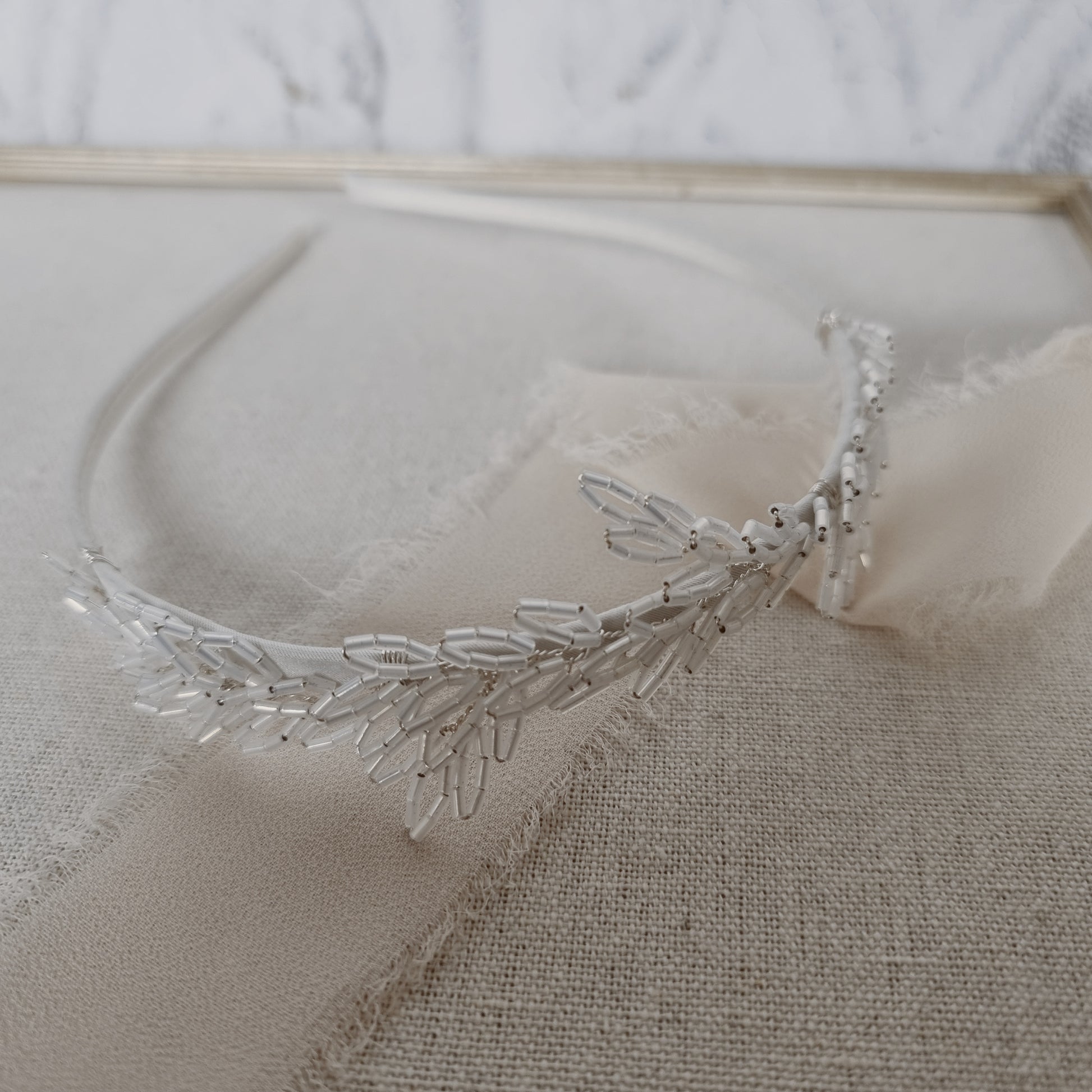 The Empress Headband features hundreds of hand-wired beads to adorn any bridal look with an elegant overlapping leaf effect. Crafted with precision, the headband is designed to stay in place for the ultimate comfort and style on your special day.