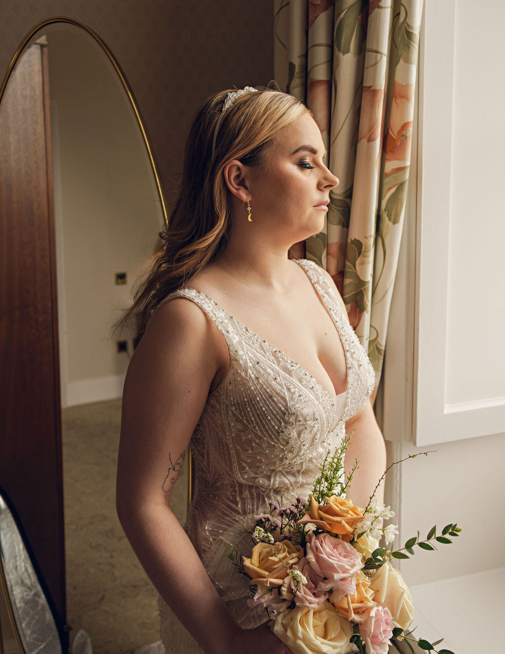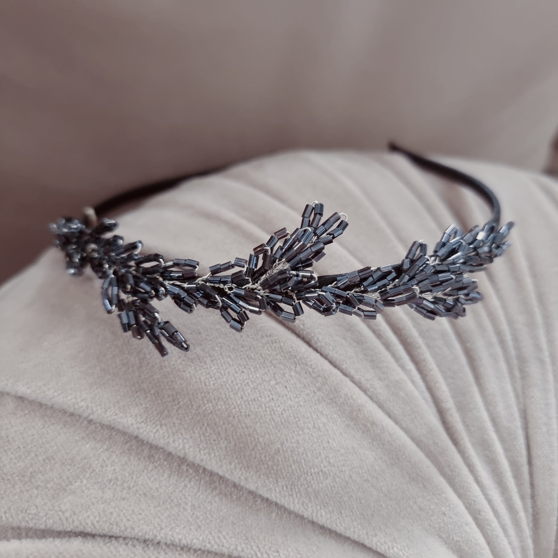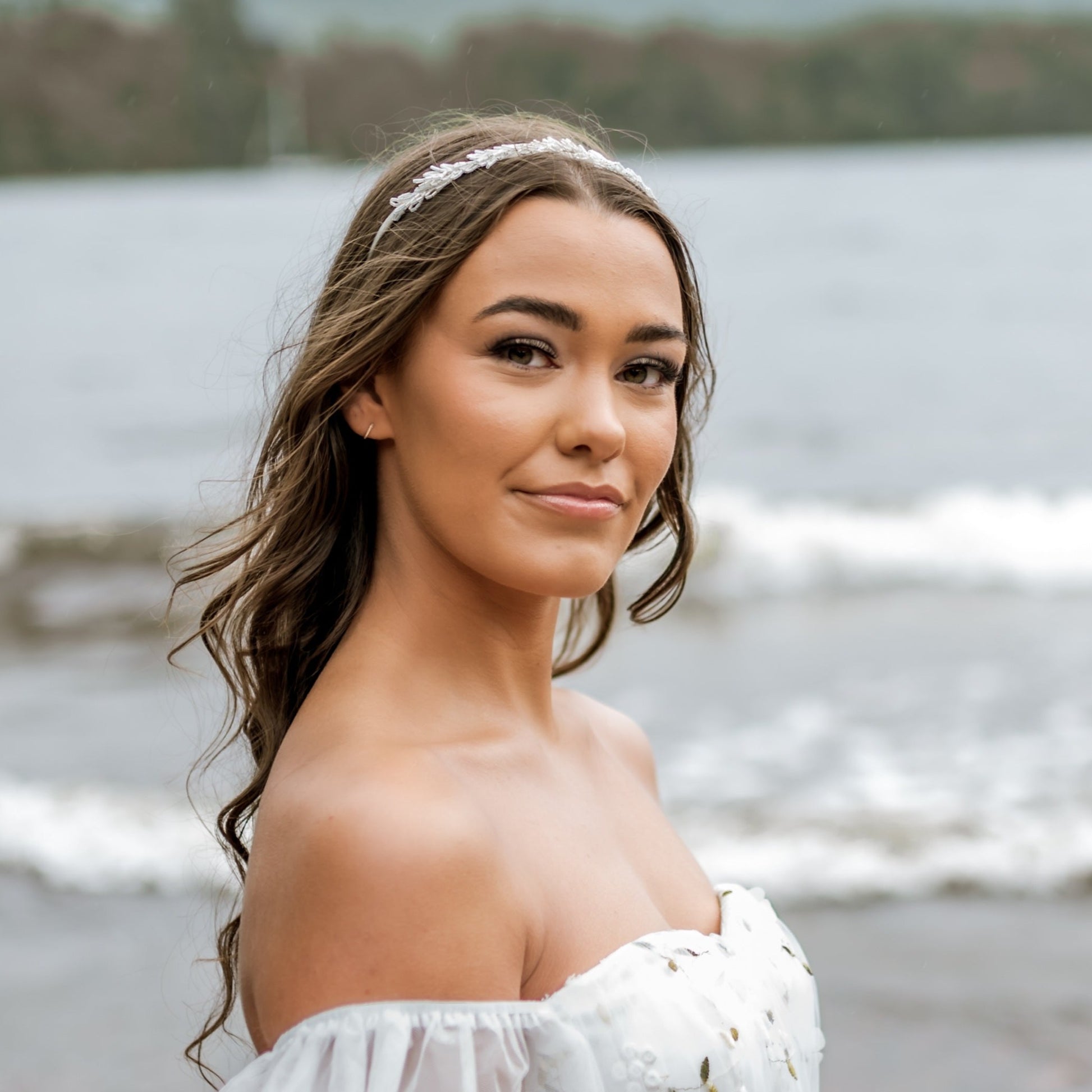 The Empress Headband features hundreds of hand-wired beads to adorn any bridal look with an elegant overlapping leaf effect. Crafted with precision, the headband is designed to stay in place for the ultimate comfort and style on your special day.