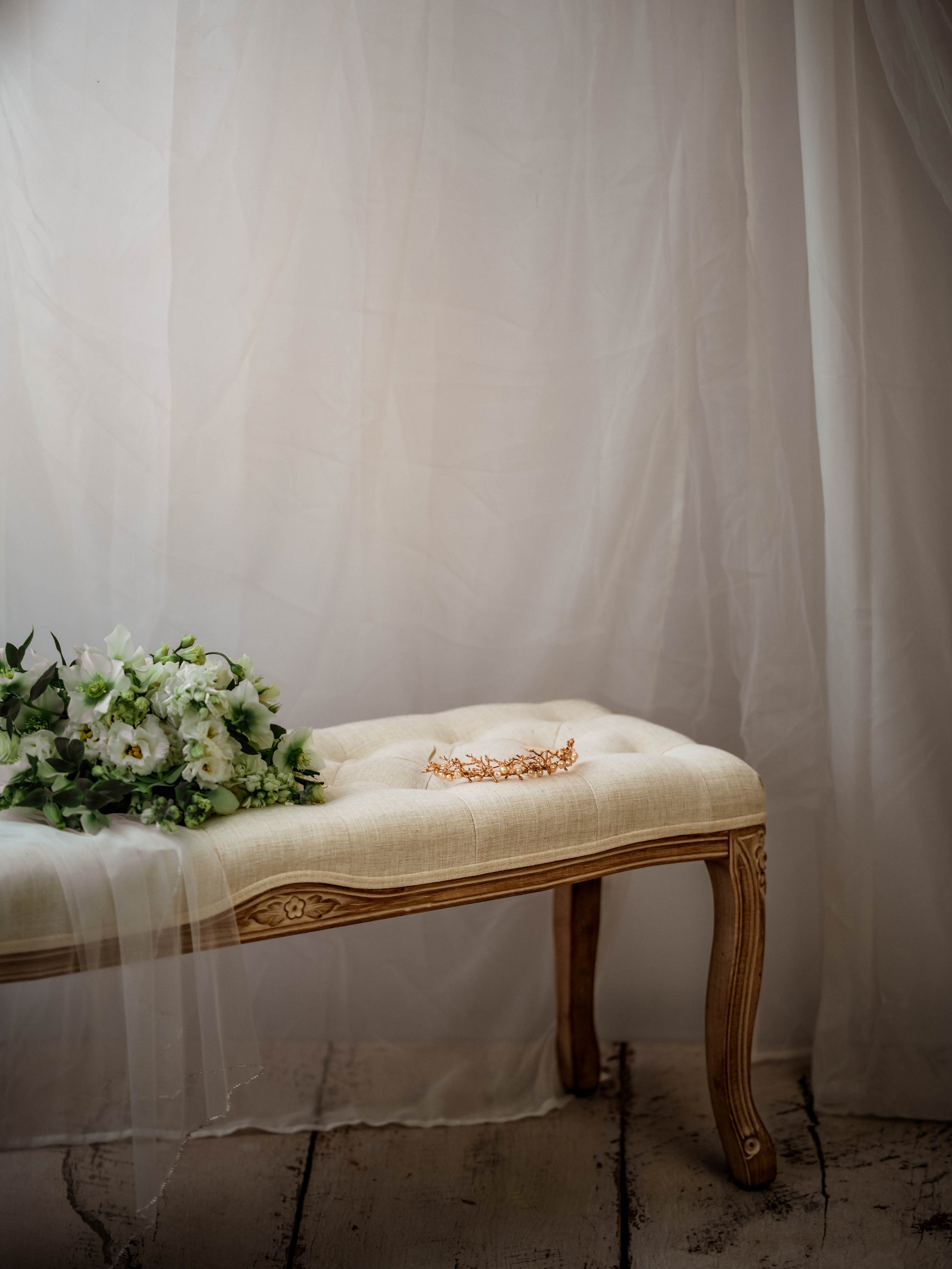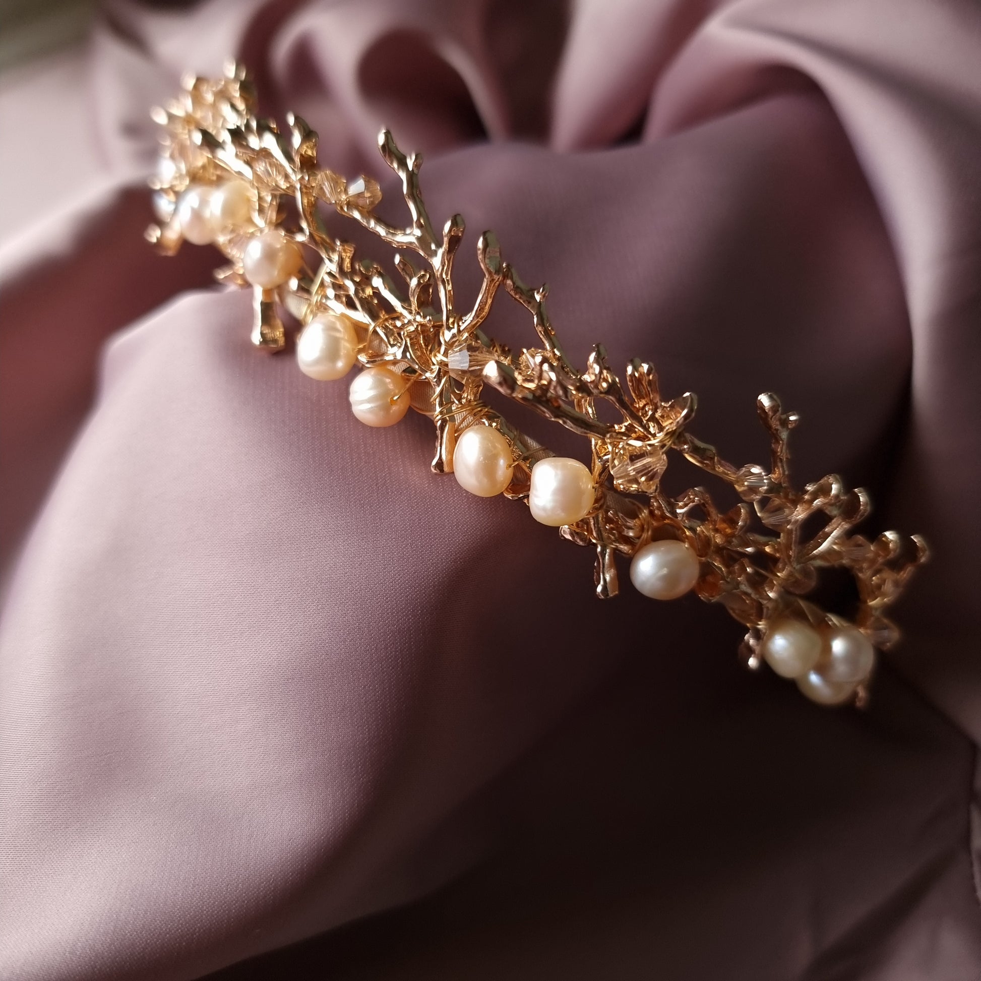 Created with a blend of golden branches, Swarovski Crystals and peach toned Freshwater Pearls.