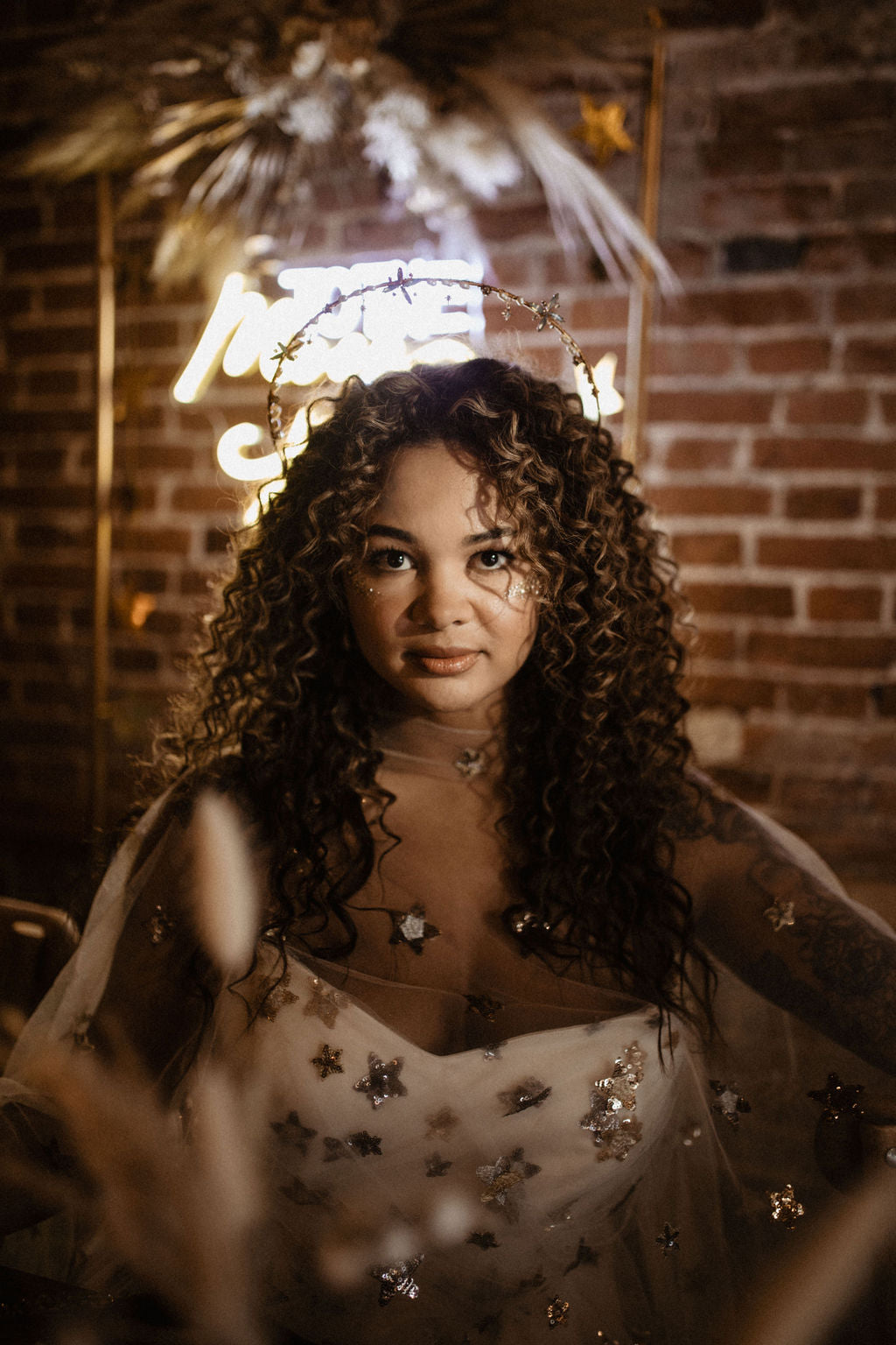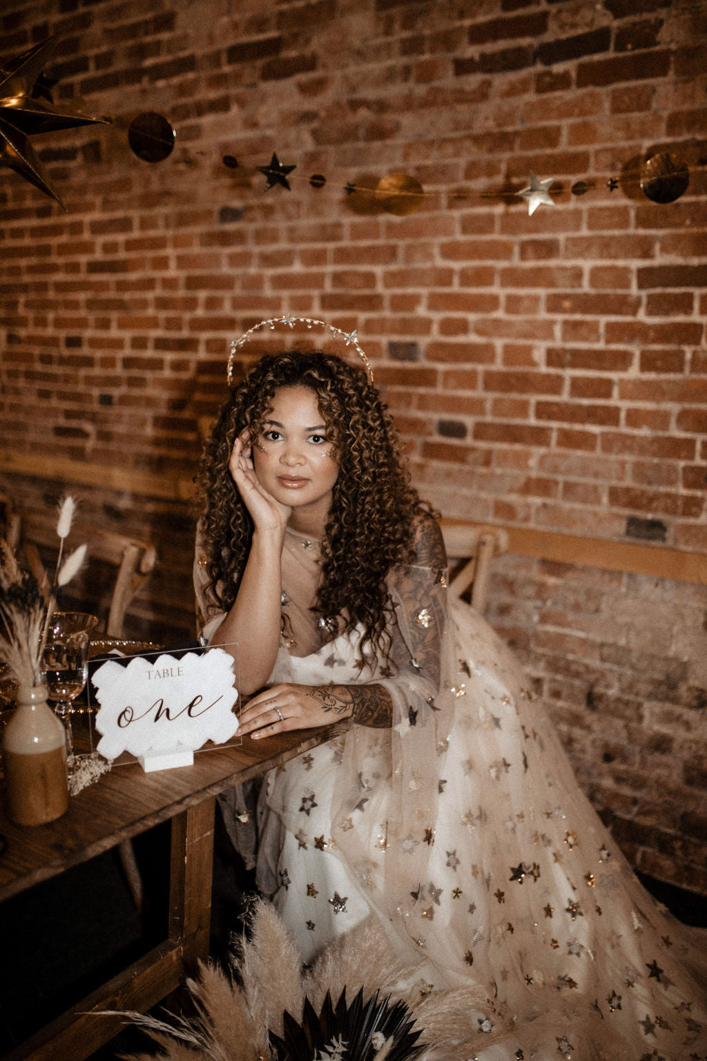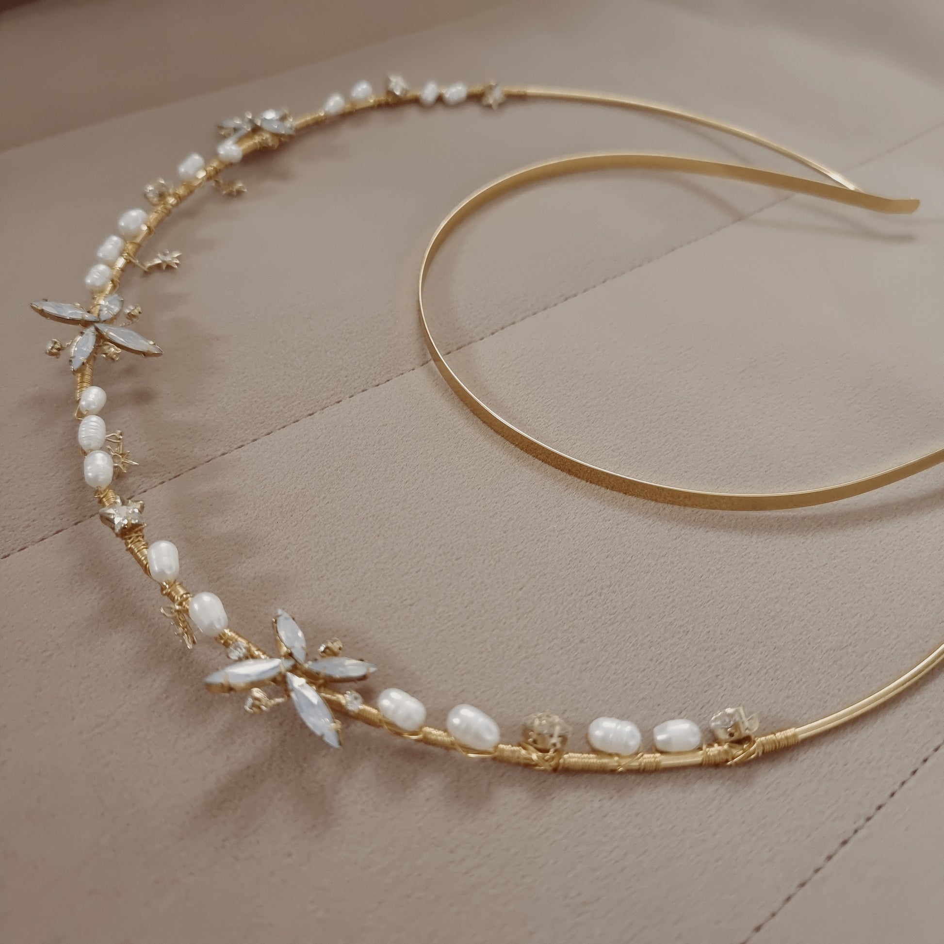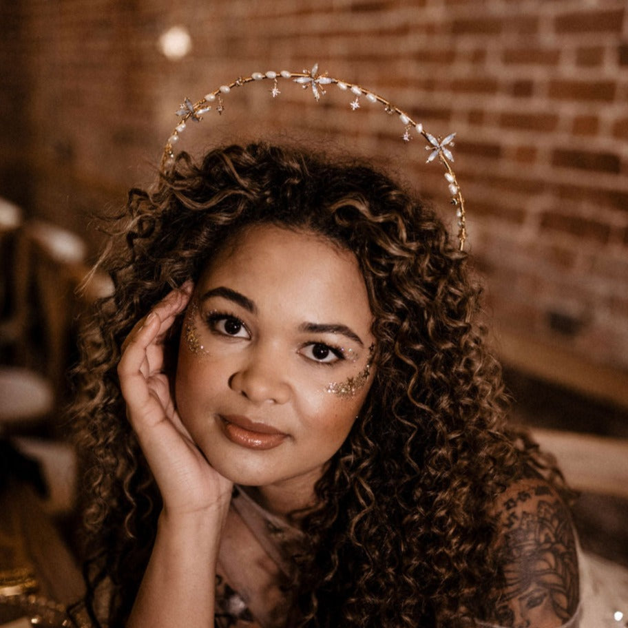 The Goddess Halo is a bridal halo crown featuring gorgeous celestial embellishments in gold. Its unique design and intricate craftsmanship make it one of a kind, perfect as a symbol of love, promise and commitment. With a timeless beauty that captures the essence of romance, it is sure to make any bride feel like a goddess on her wedding day.