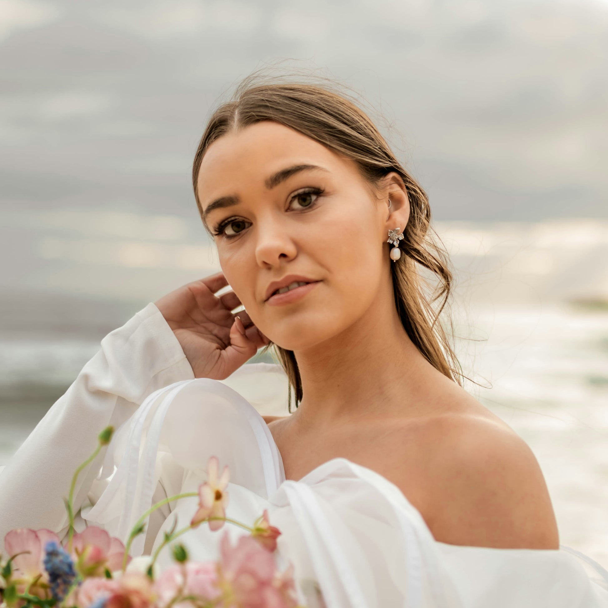 Transform your look with the Moonblossom Earrings. These elegant studs are plated with luxurious rhodium and feature a delicate blossom flower design. The freshwater pearl drops add a touch of sophistication.
