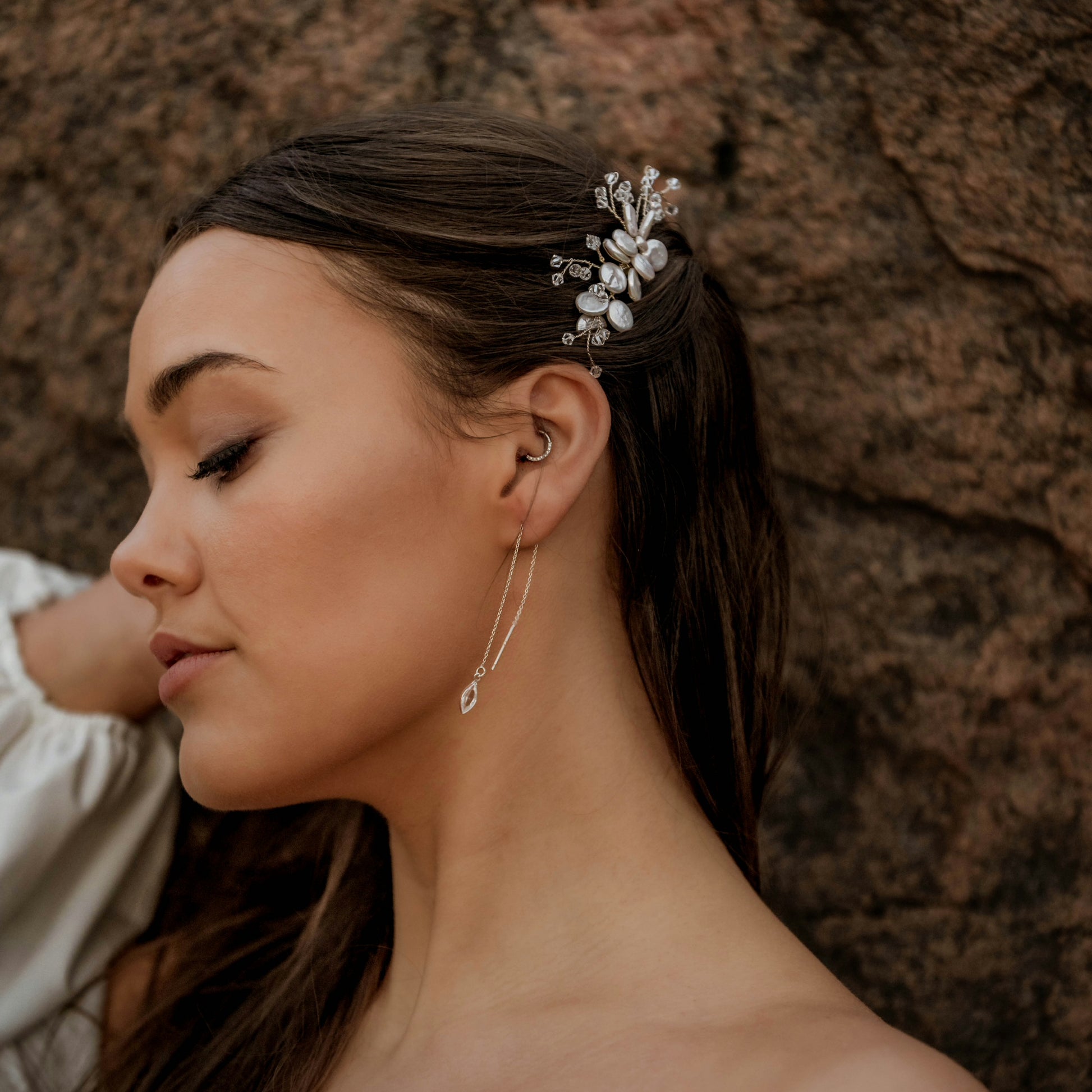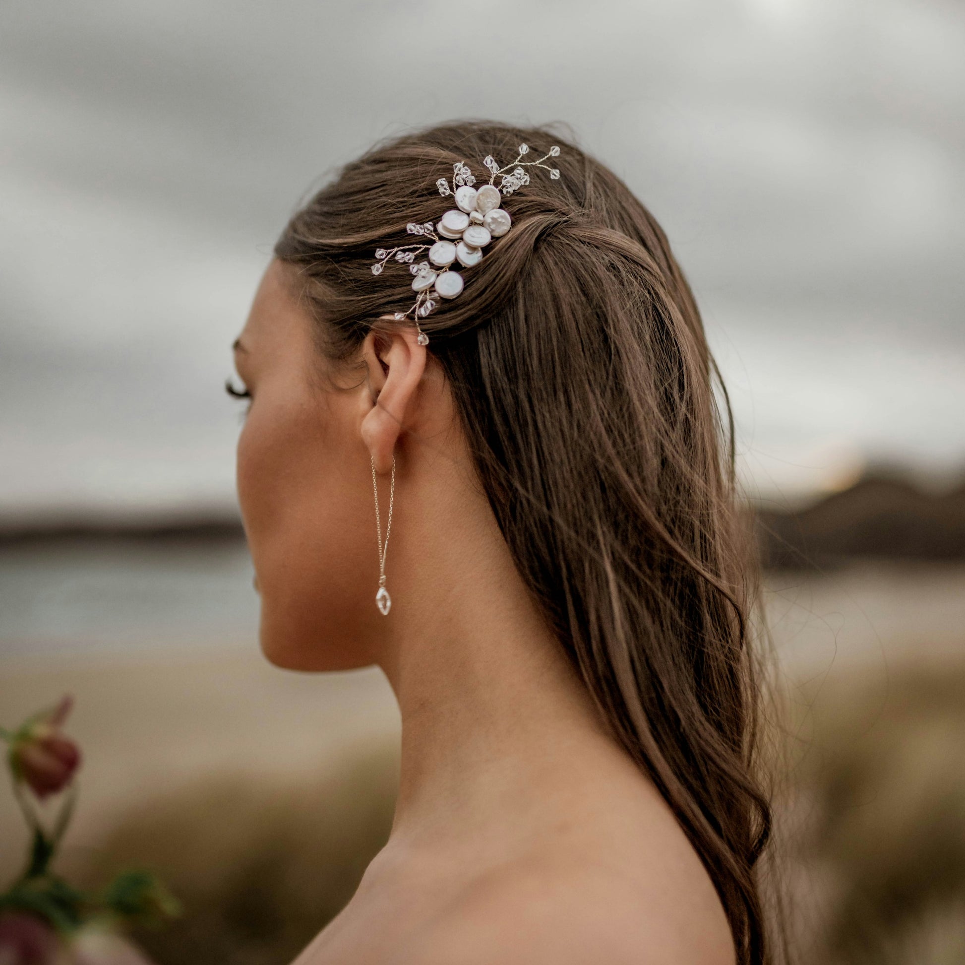 Our Moonblossom Mini Comb is crafted with a delicate size and hair comb, combined with iridescent coin pearls and Austrian crystals to create a floral-inspired look. This piece is a perfect choice to create a subtly romantic look on the special day.