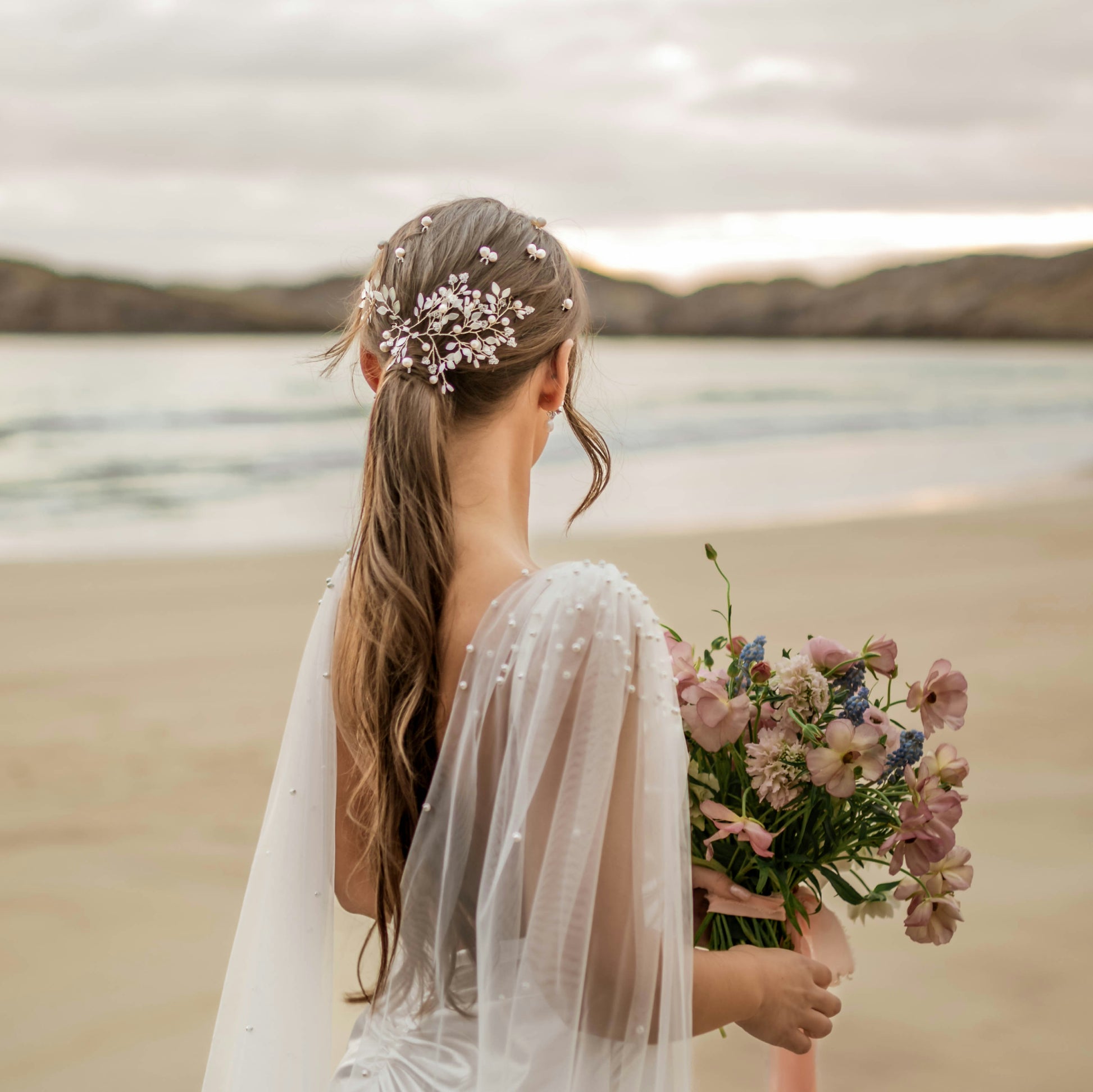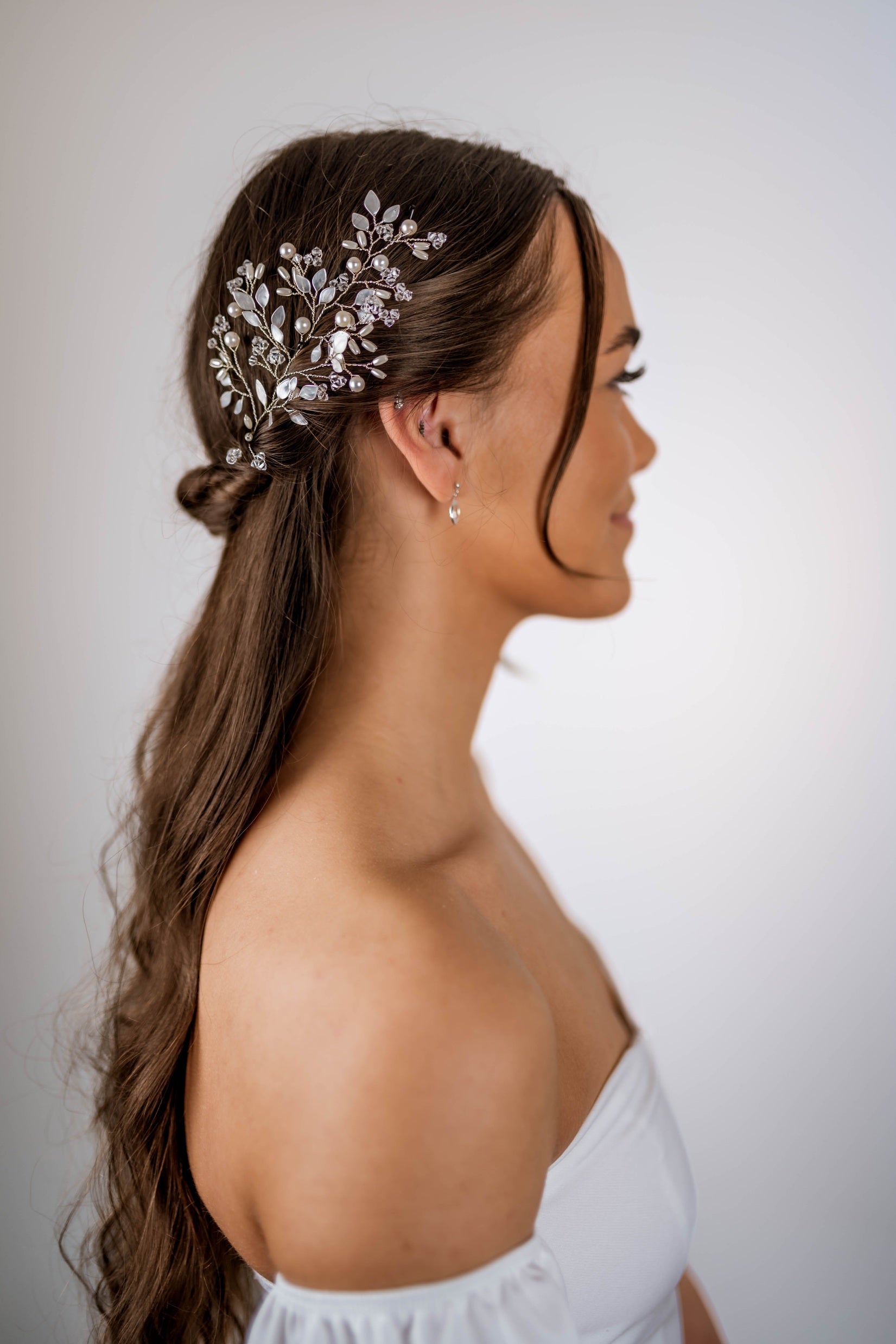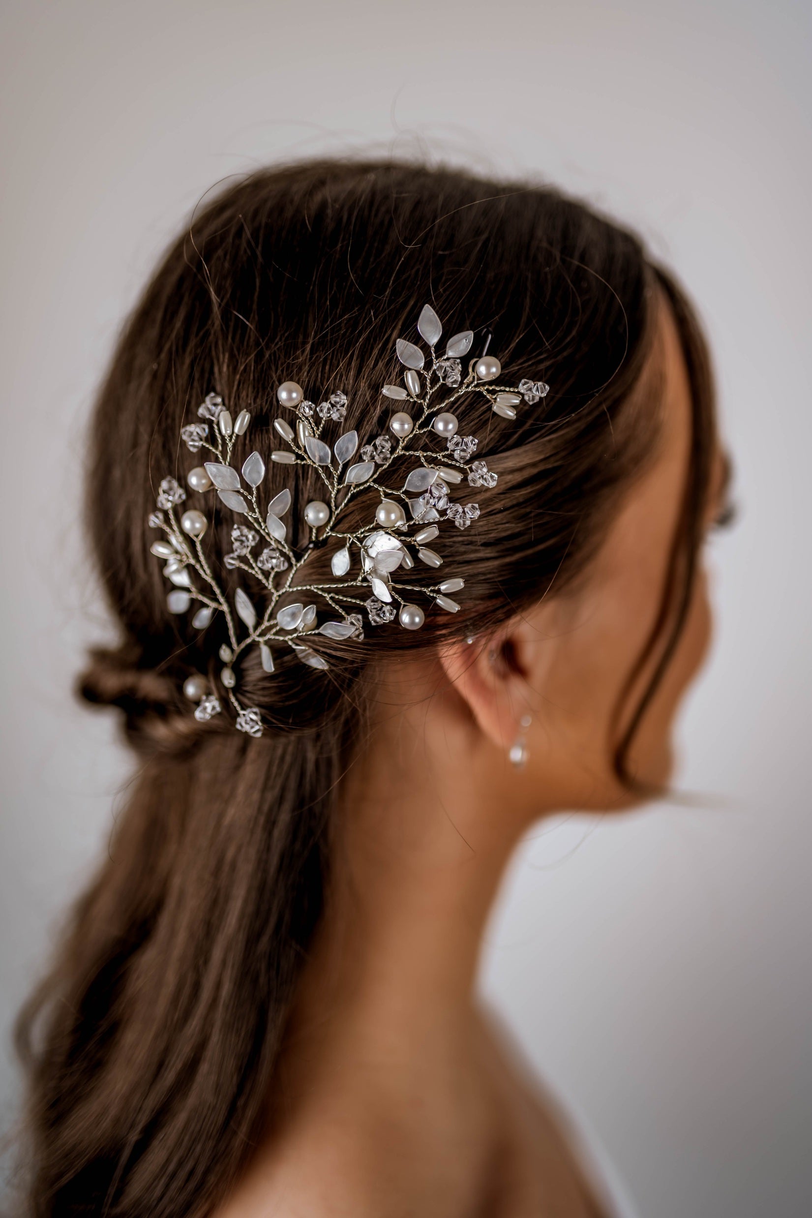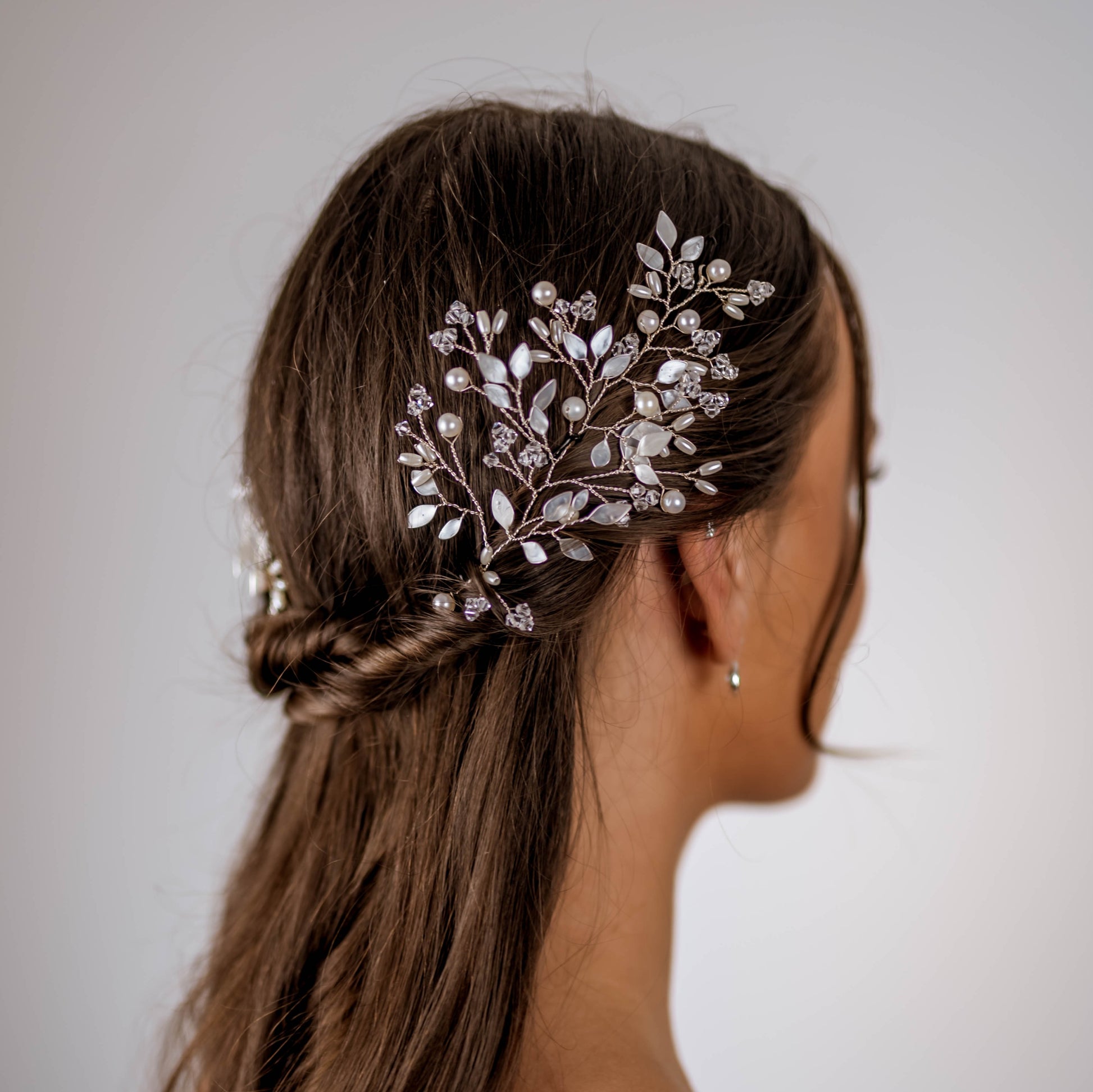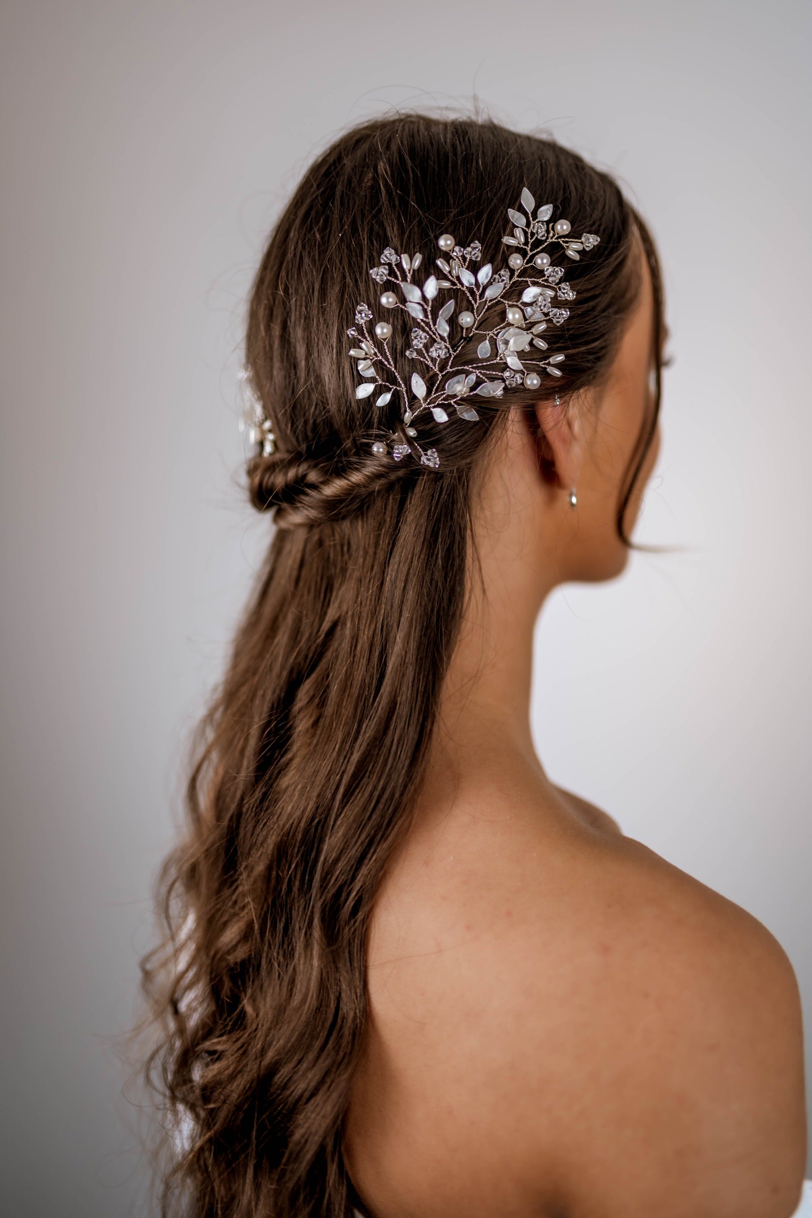 - Set with two loops at either end of the vine so that the hairpiece can be pinned in place with hair grips.