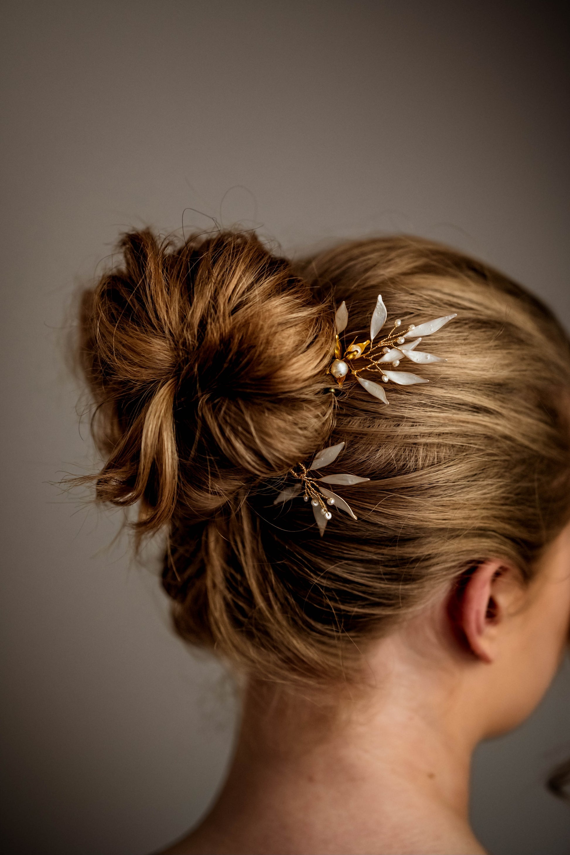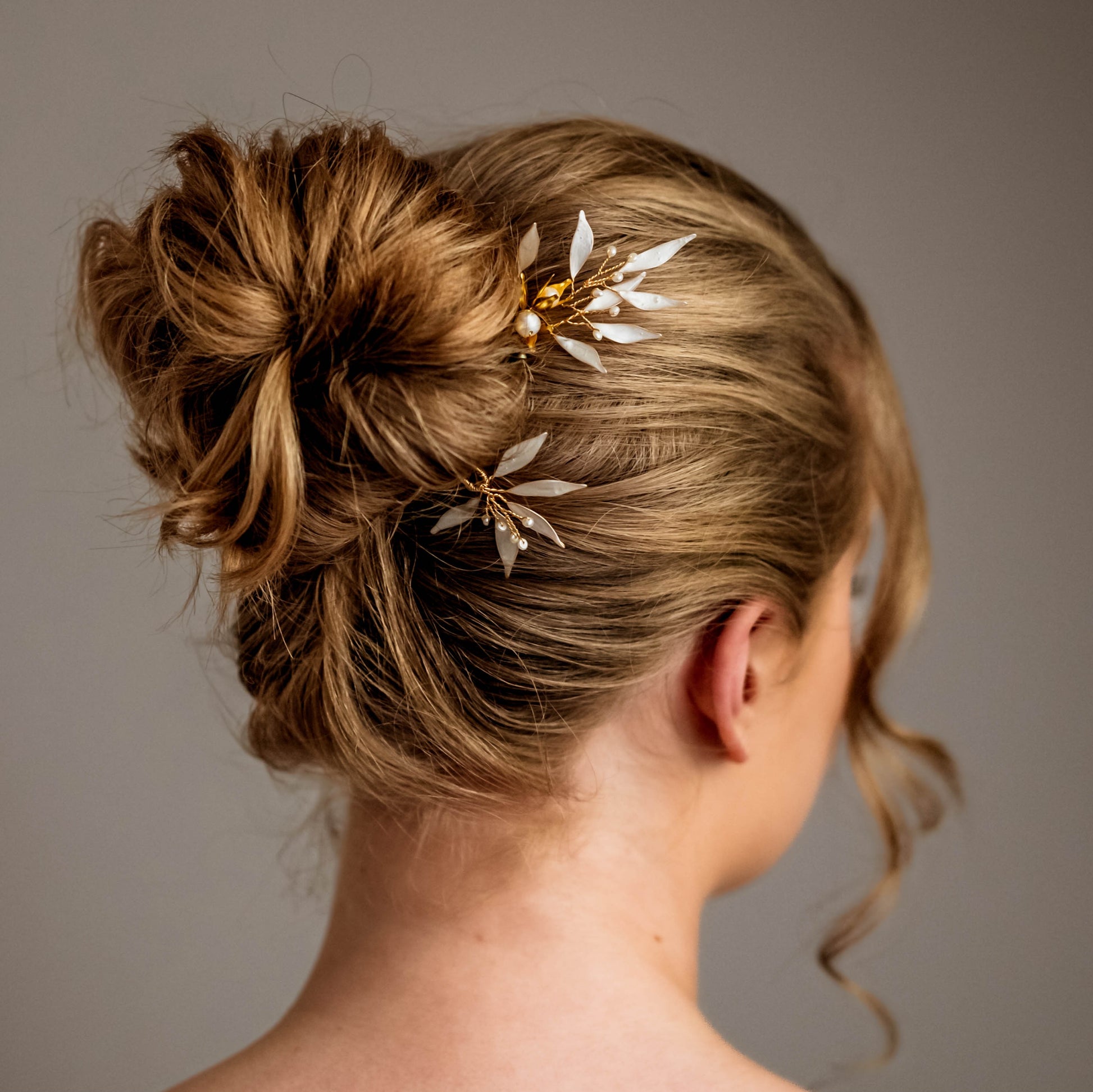 Whimsical hairpins set with metal flowers with a pearl center, a scattering of seed pearls and hand shaped petals.