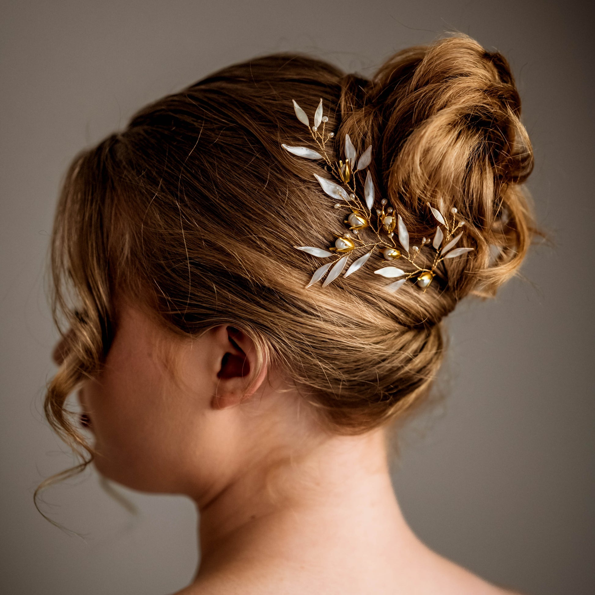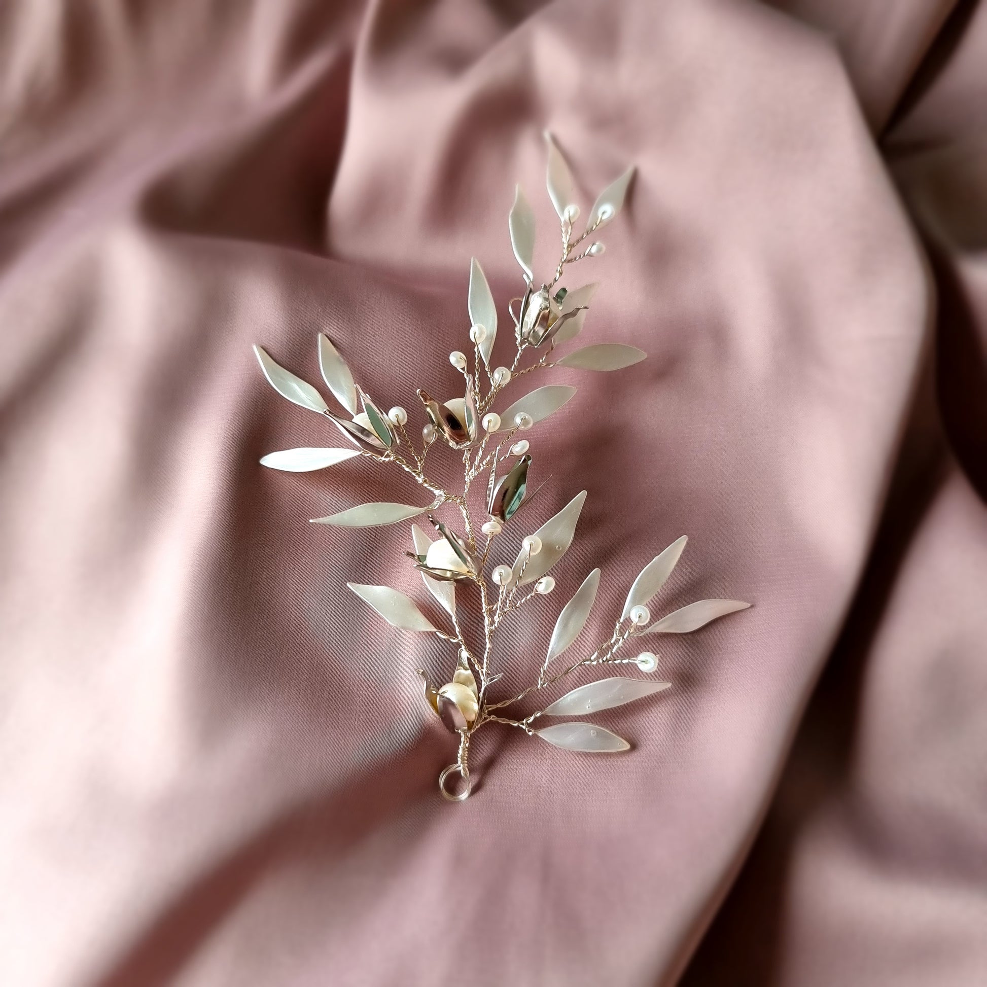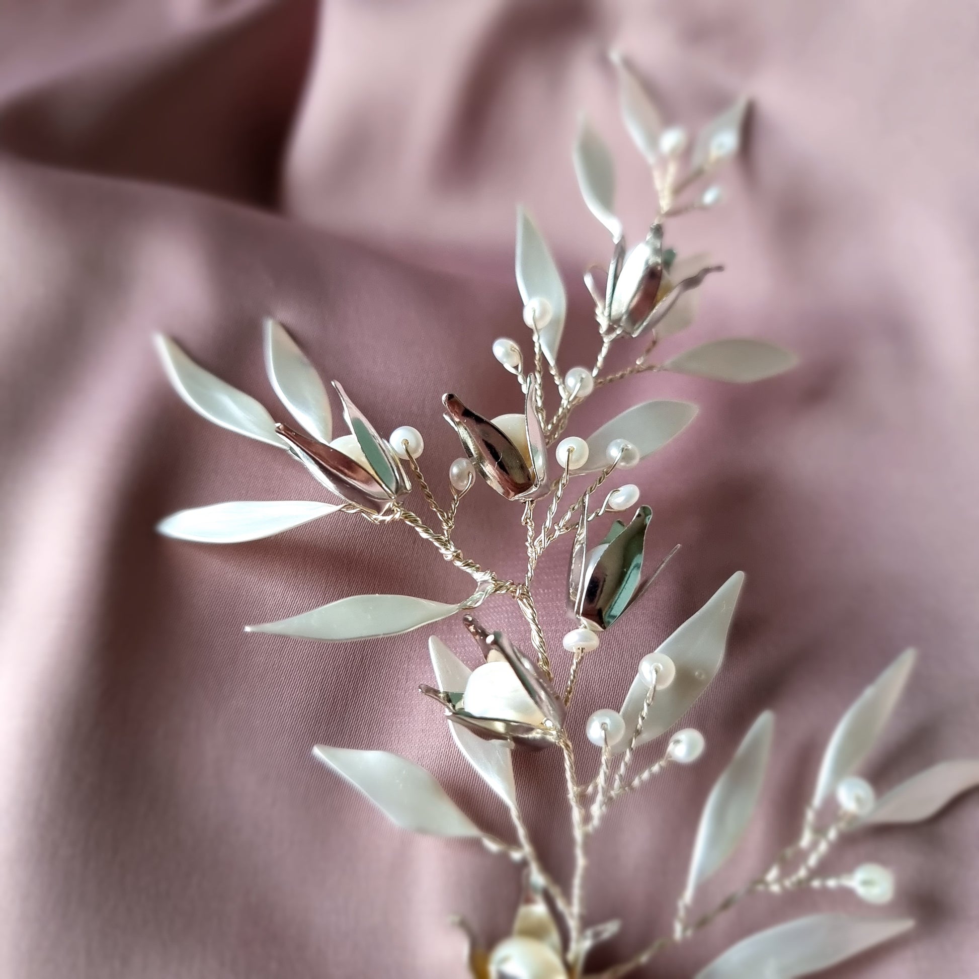 A whimsical hairvine set with metal flowers with a pearl center, a scattering of seed pearls and hand shaped petals.