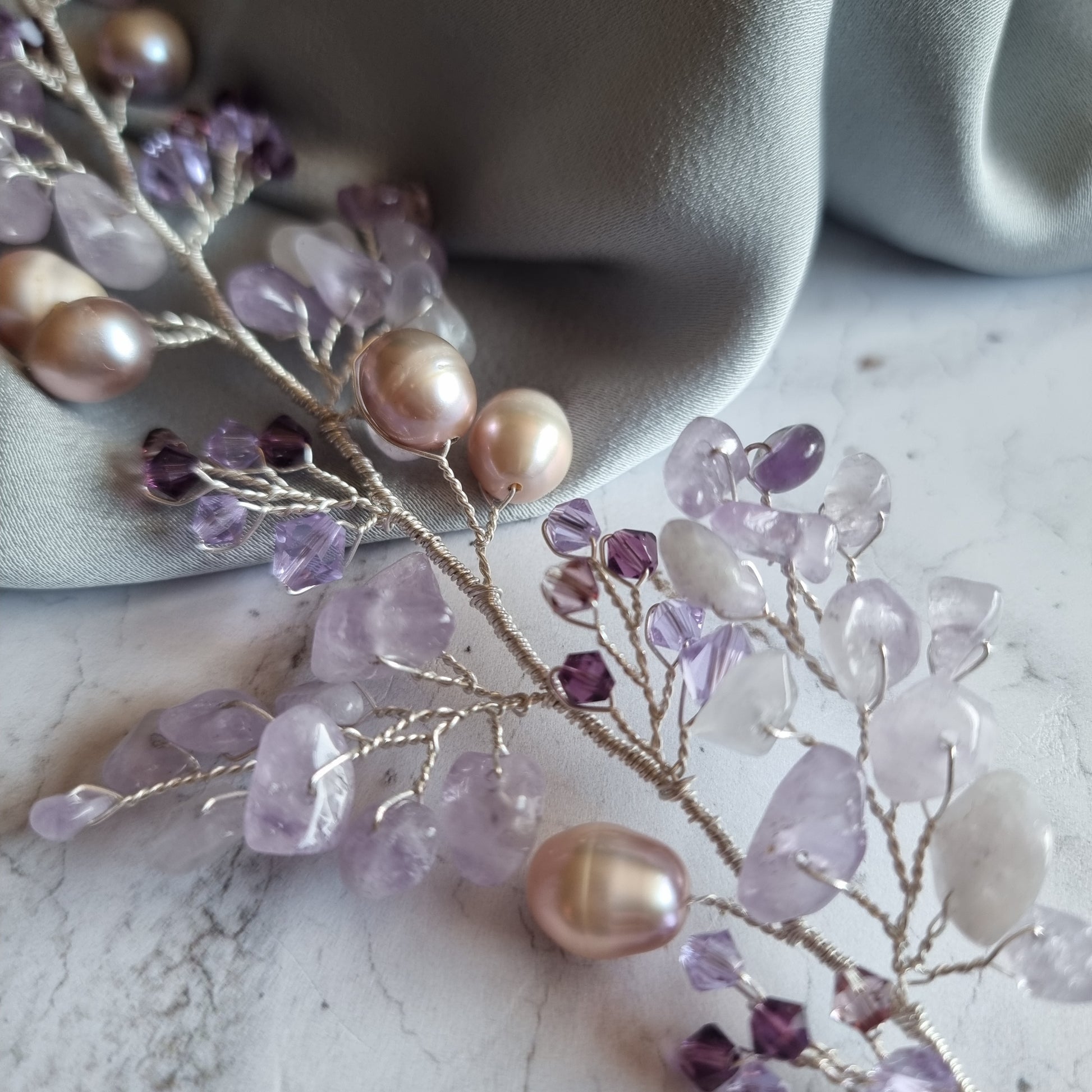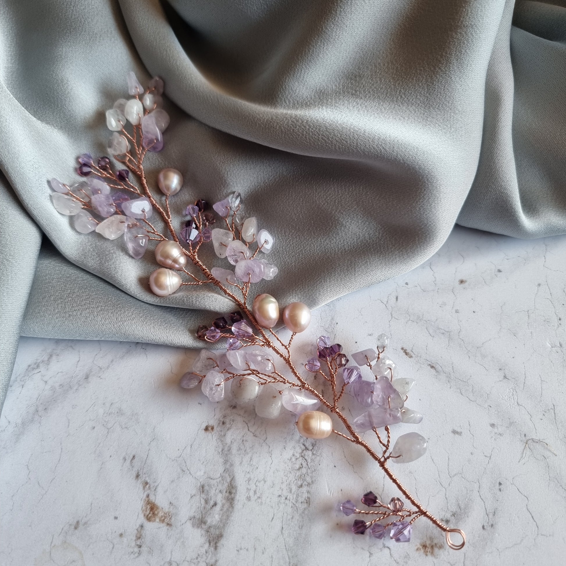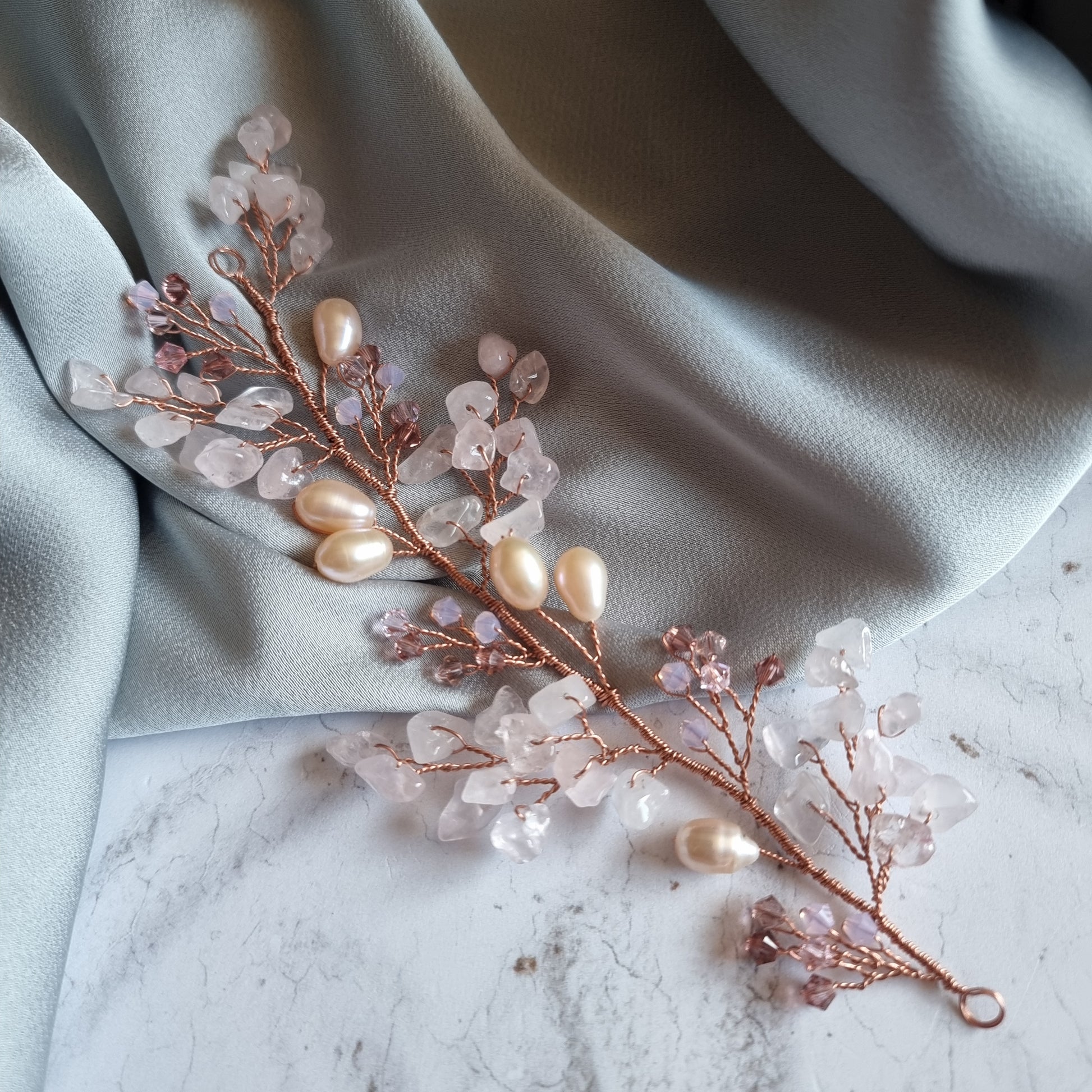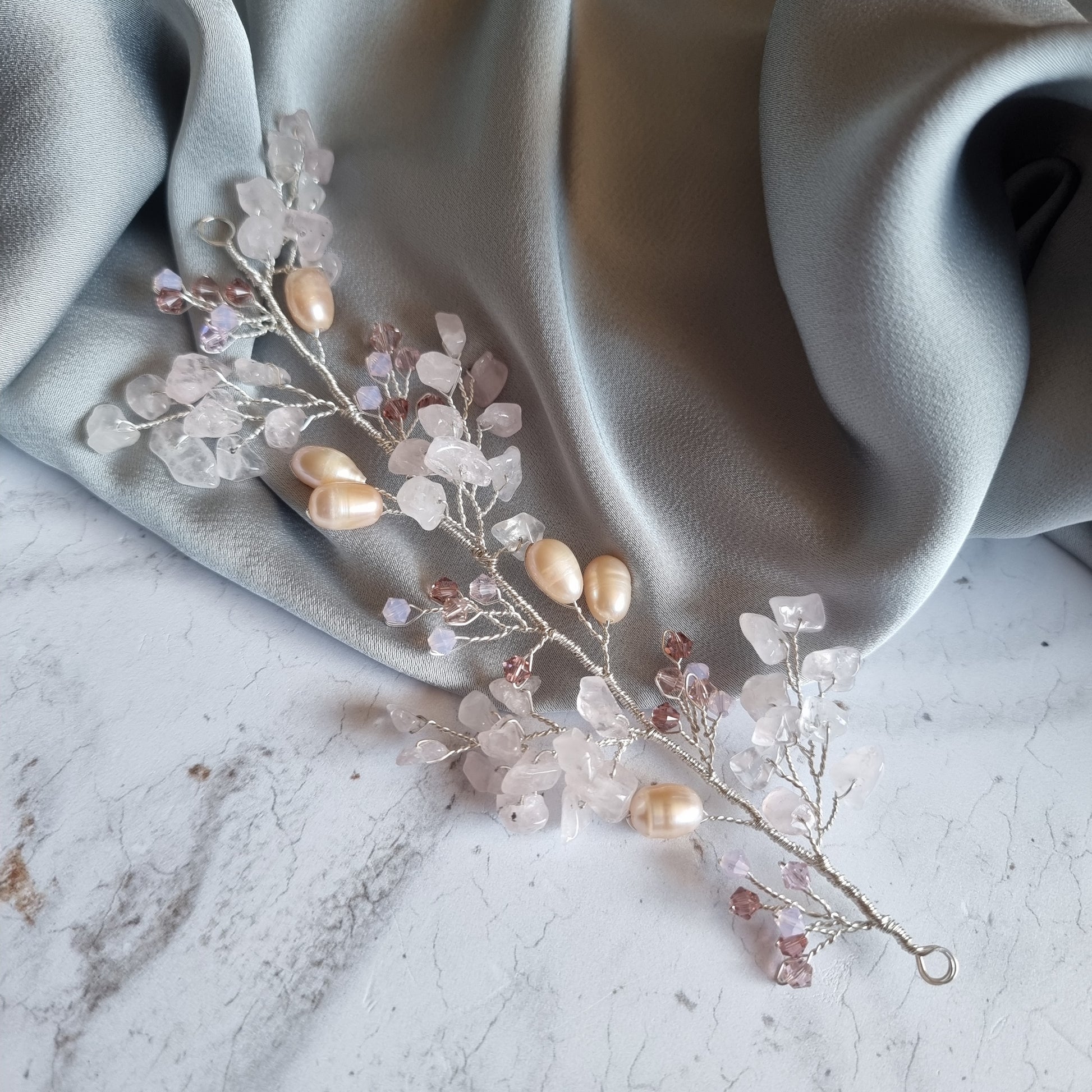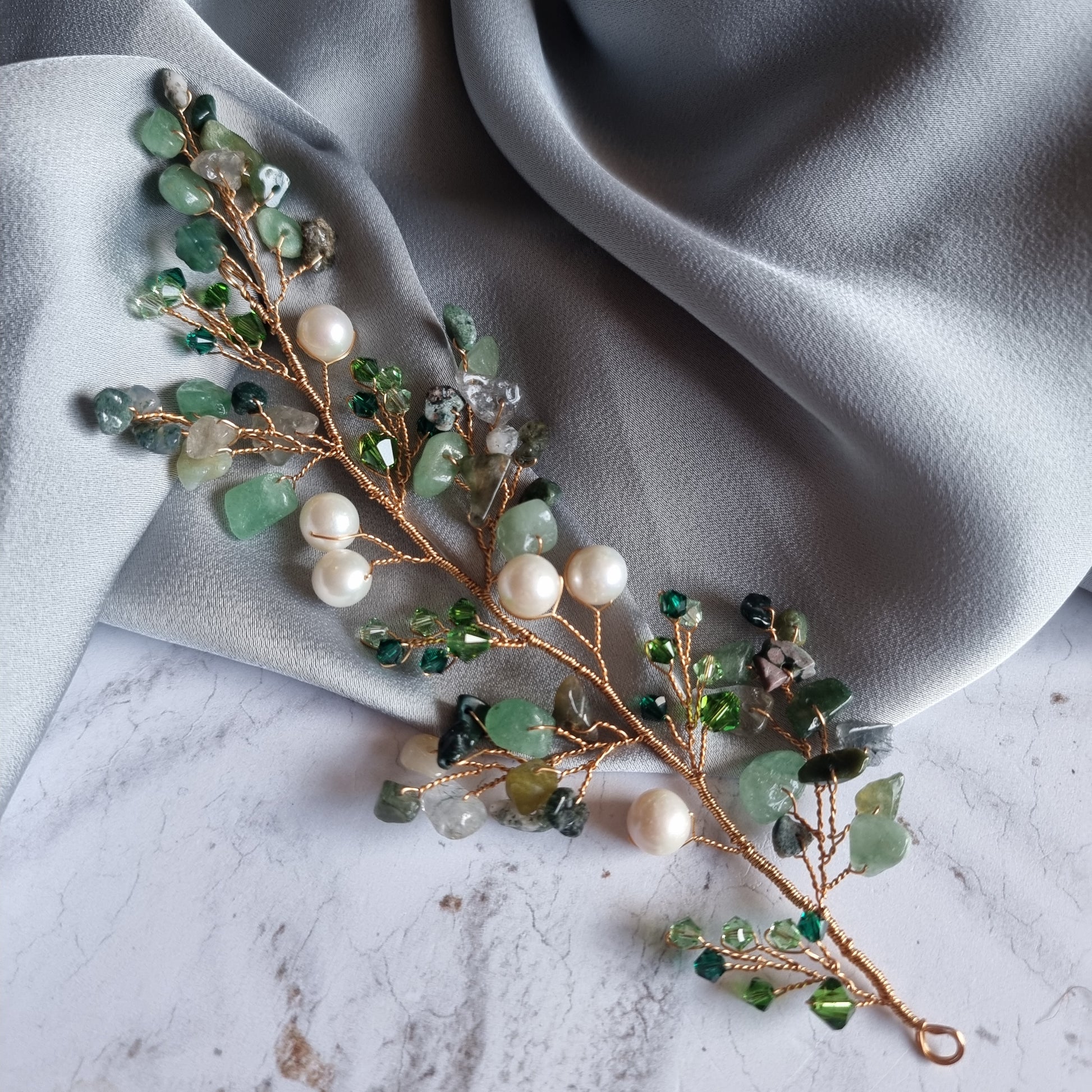 -This nature inspired mid-length hairvine is carefully hand crafted by wiring individual swarovski crystals, freshwater pearls and tumbled semi-precious gemstones onto flexible wire.