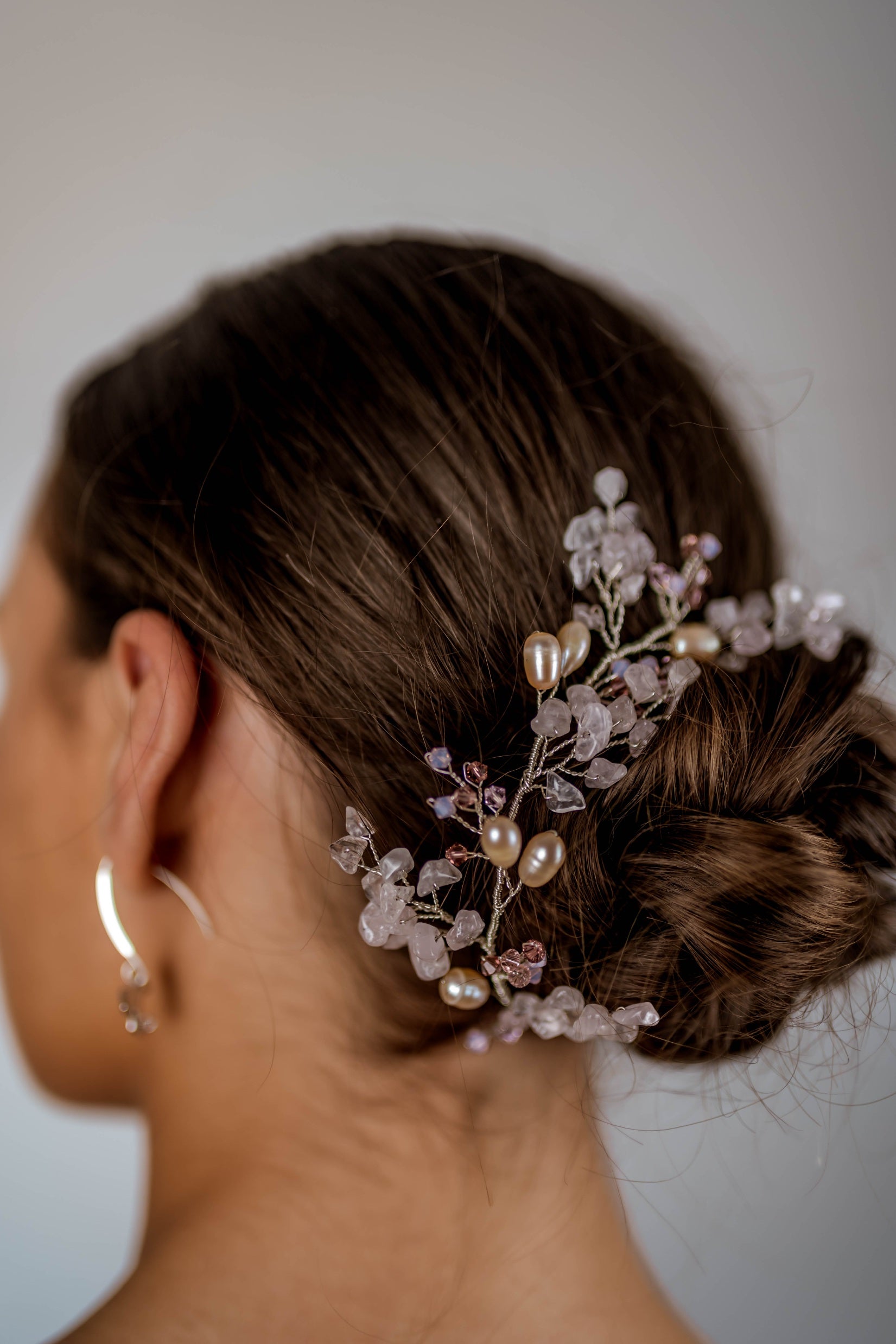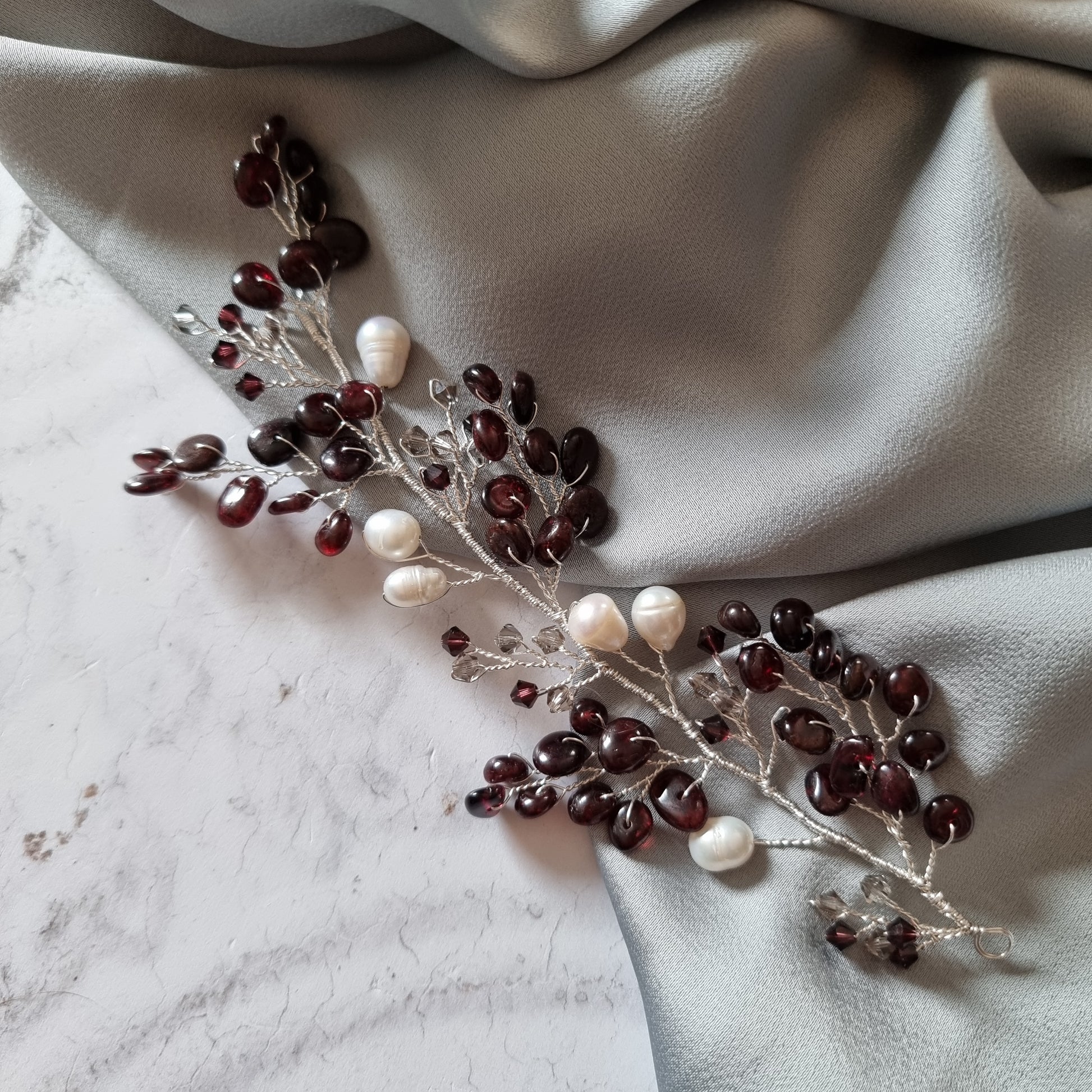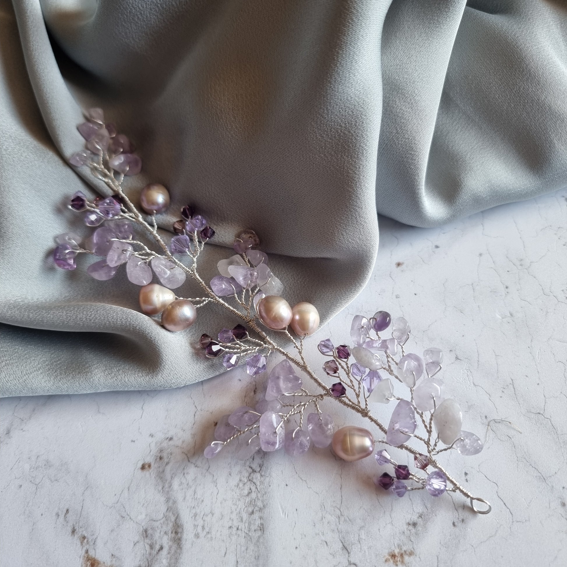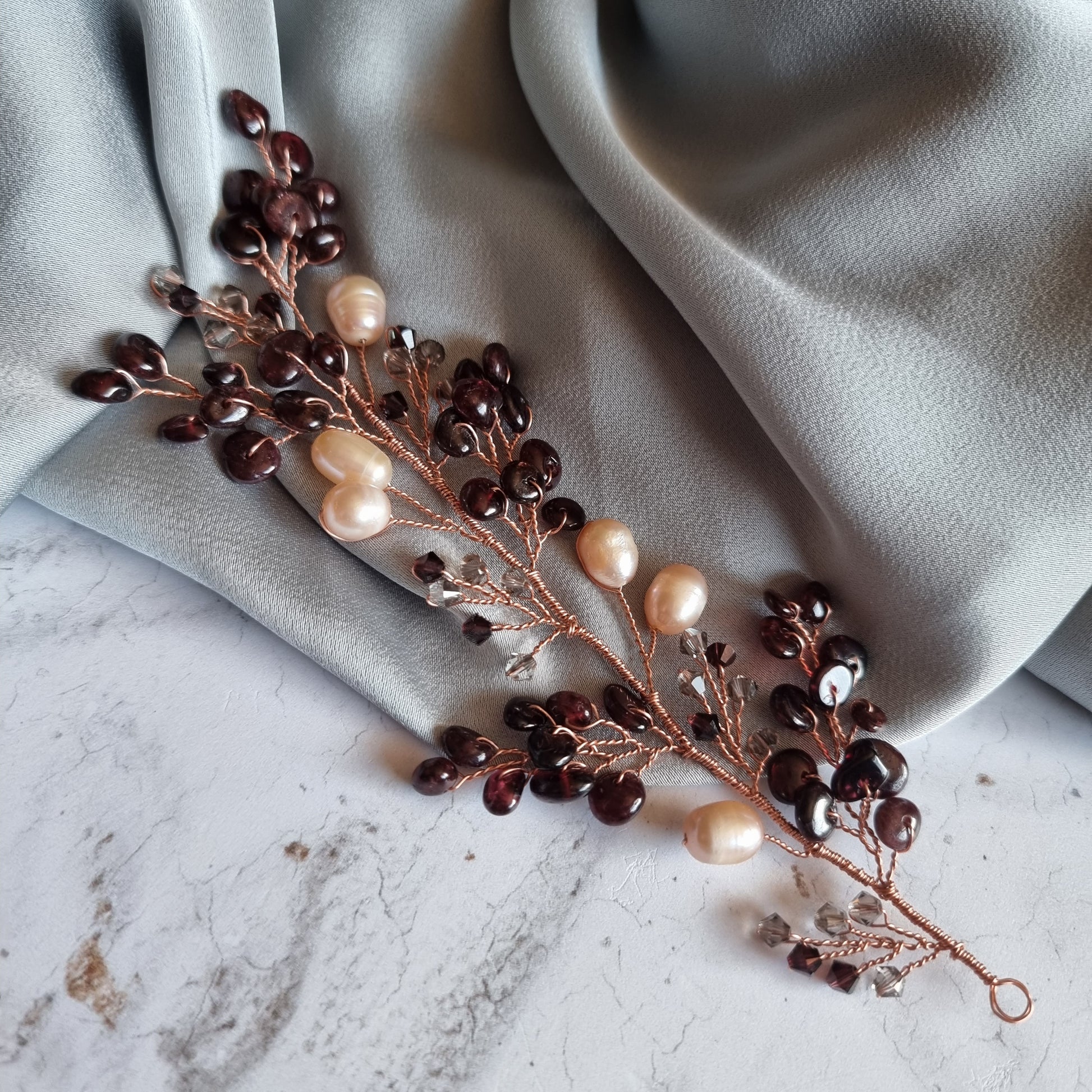 -This nature inspired mid-length hairvine is carefully hand crafted by wiring individual swarovski crystals, freshwater pearls and tumbled semi-precious gemstones onto flexible wire.