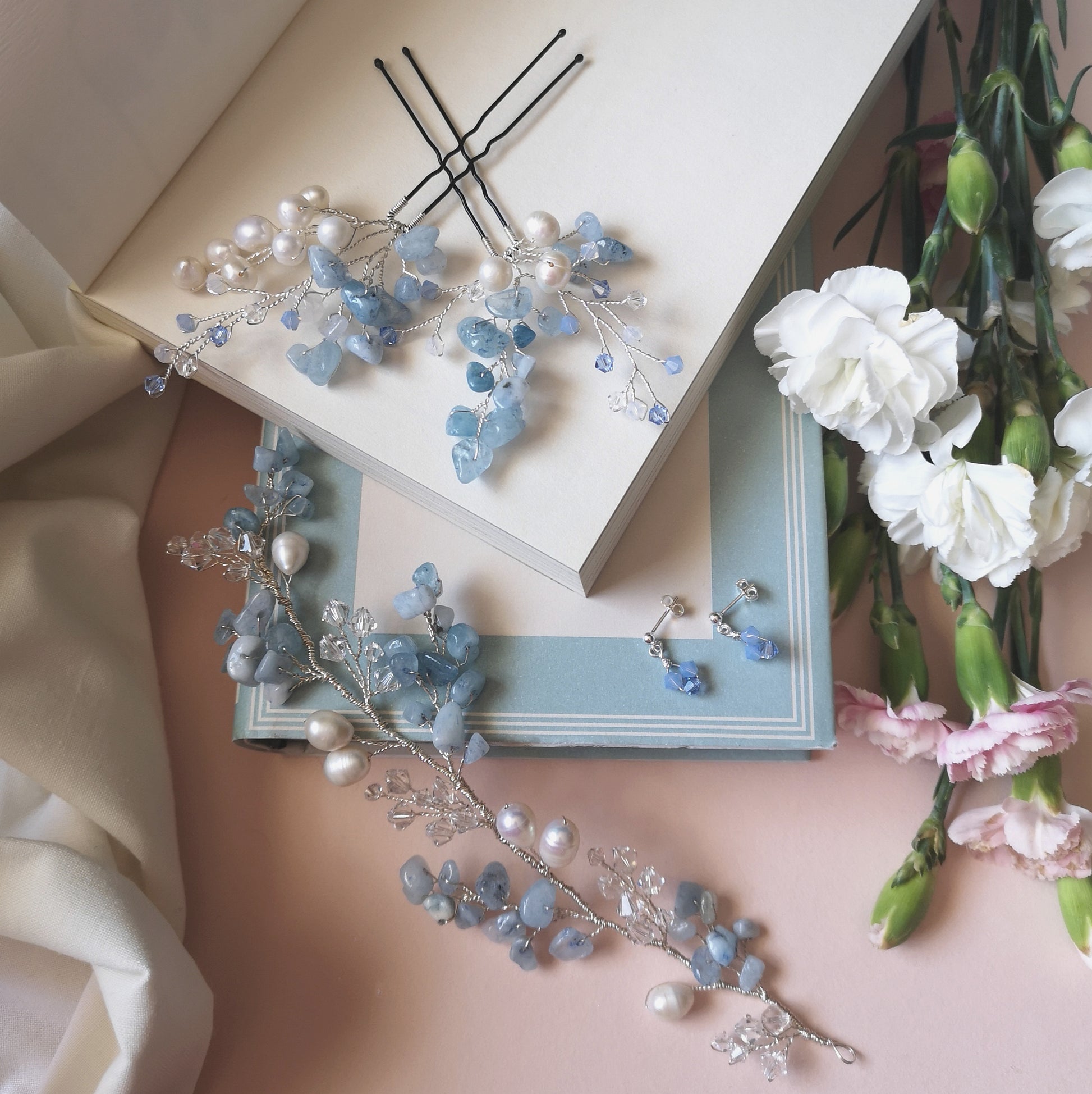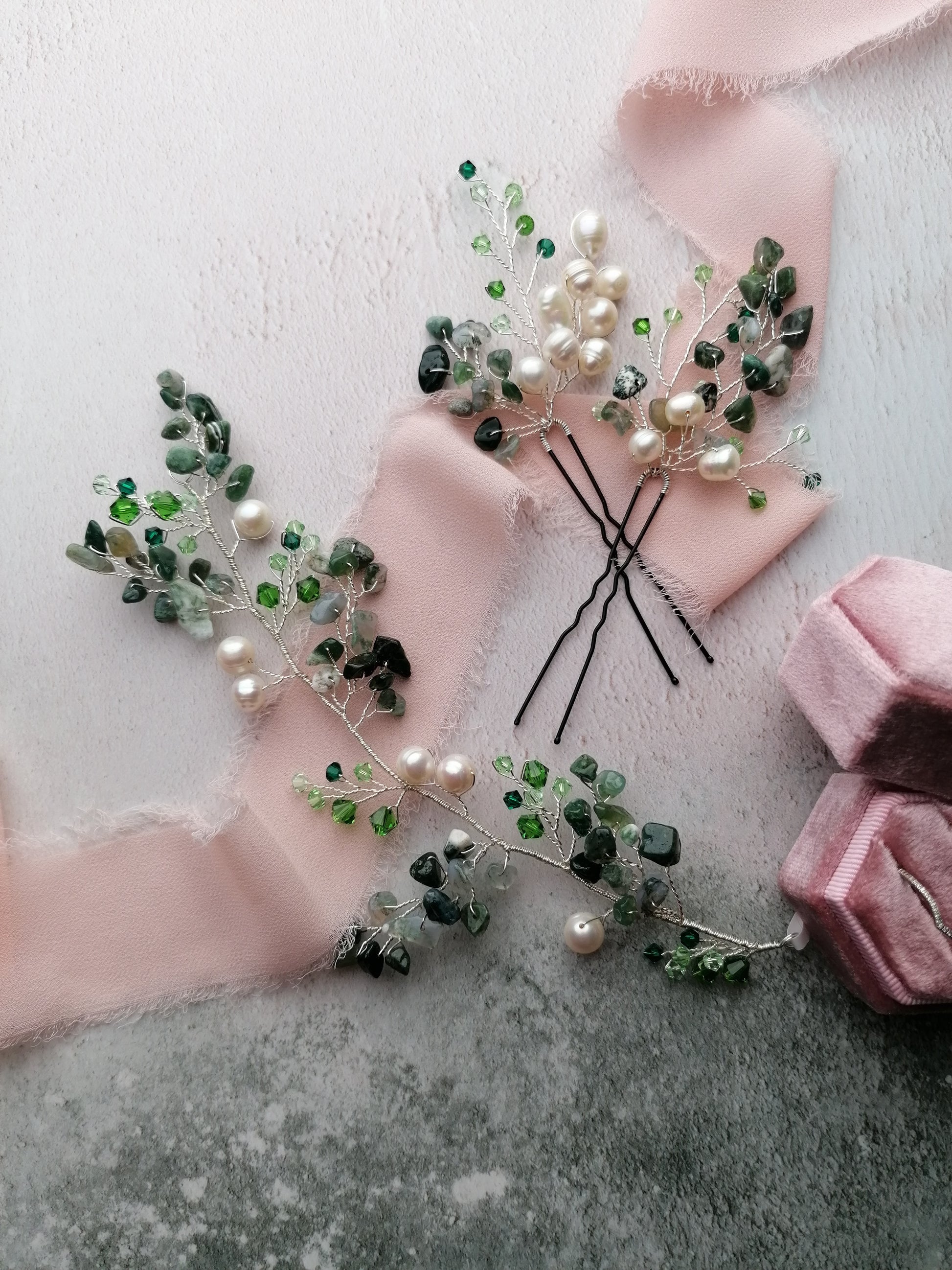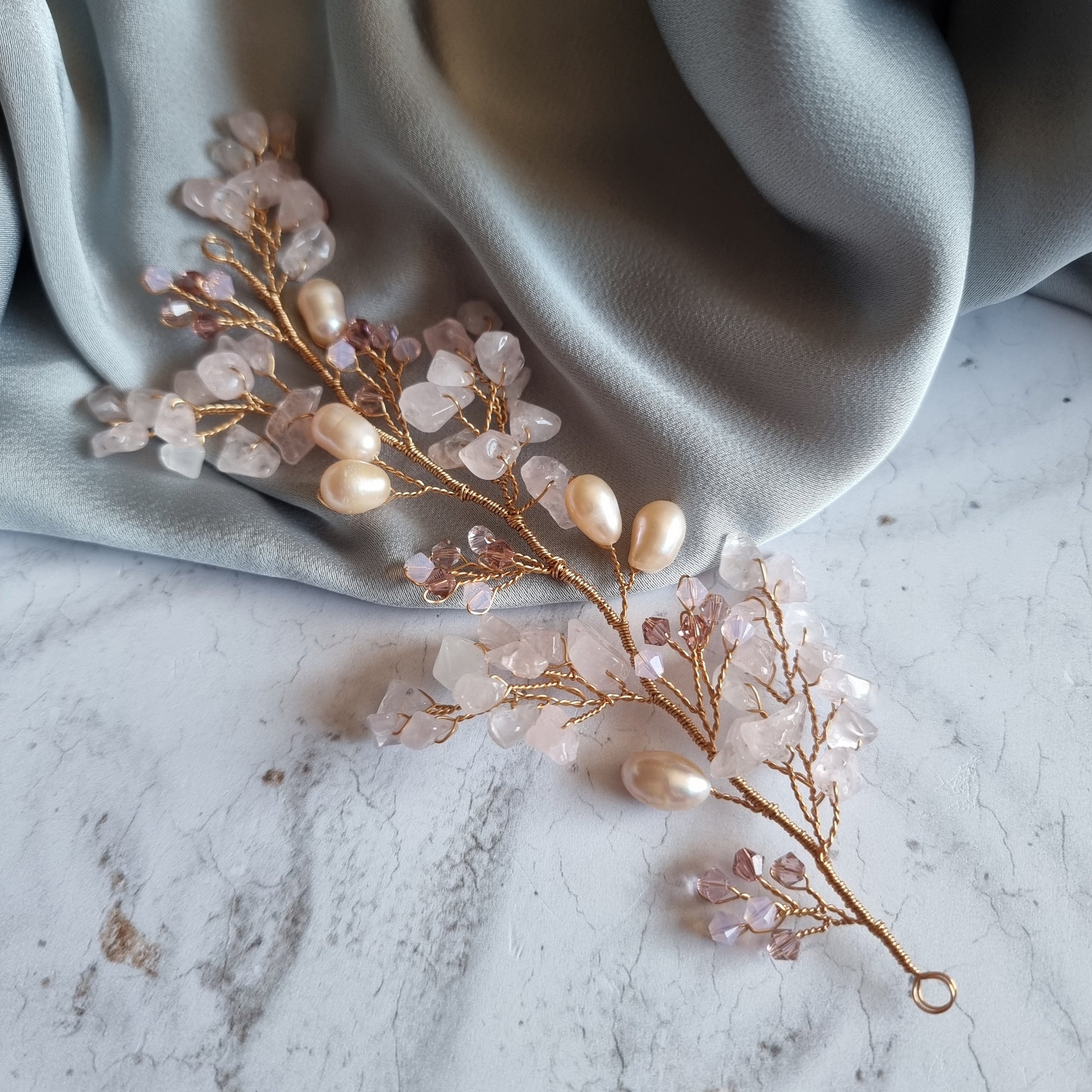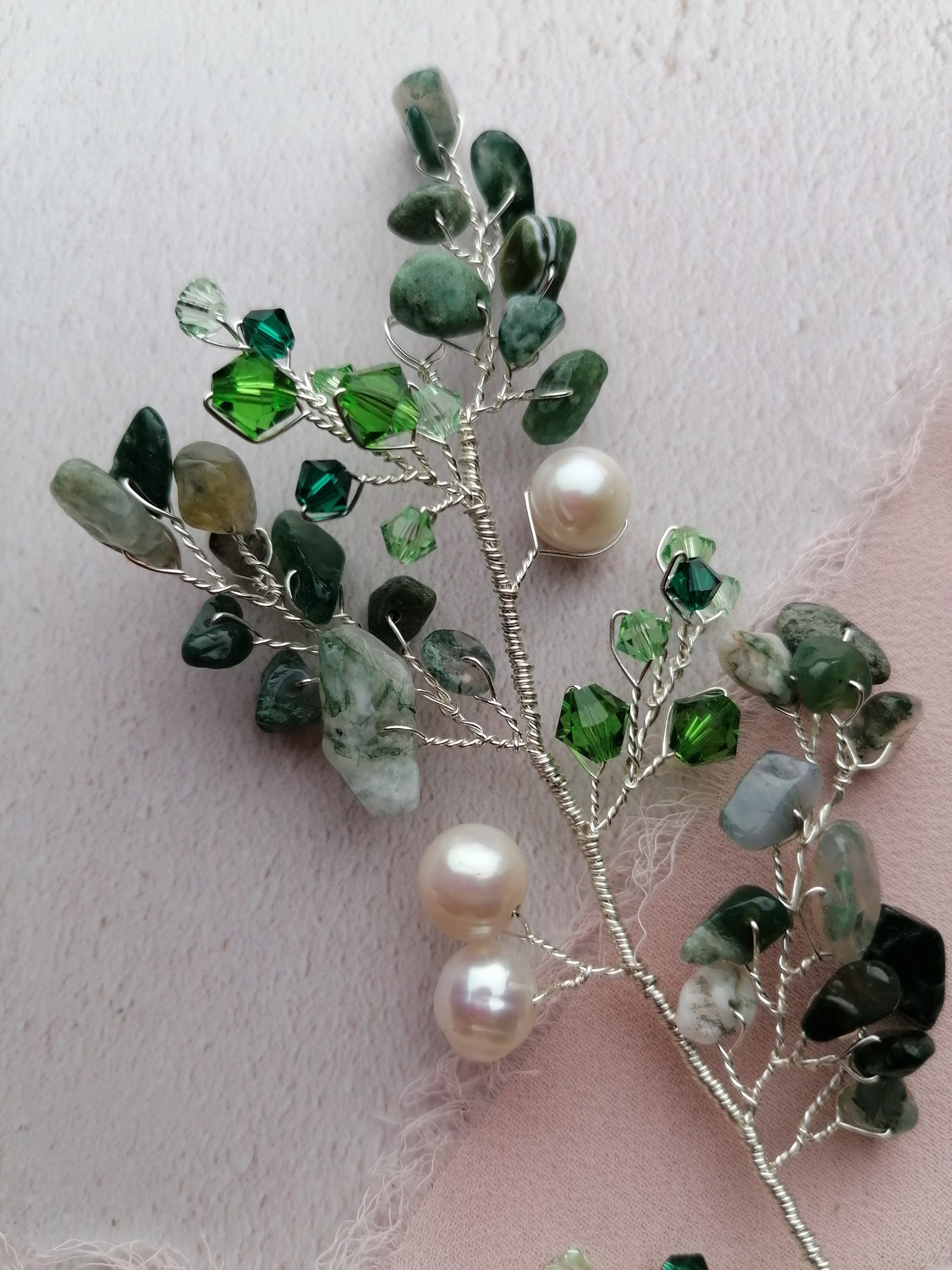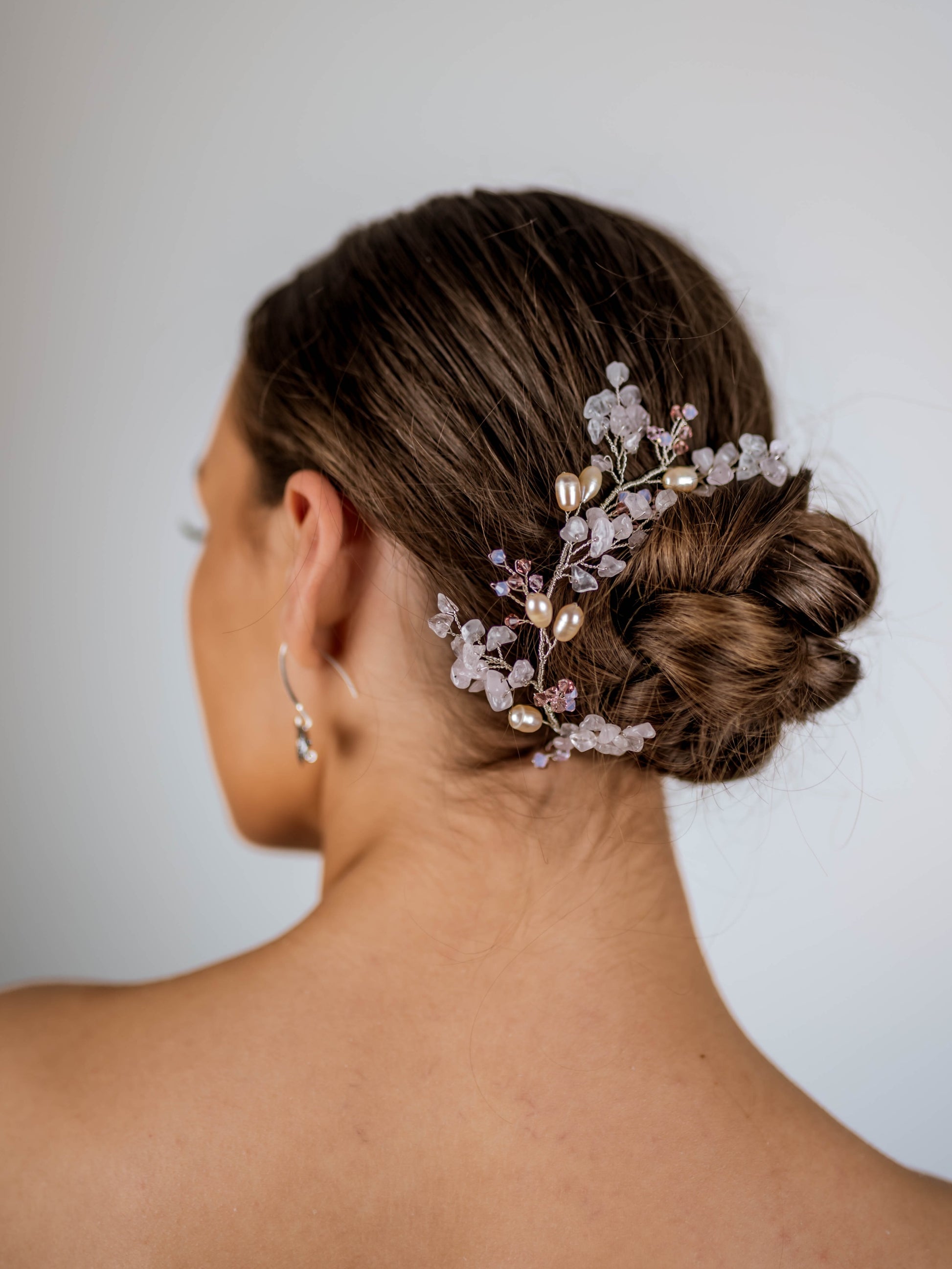 -This nature inspired mid-length hairvine is carefully hand crafted by wiring individual swarovski crystals, freshwater pearls and tumbled semi-precious gemstones onto flexible wire.